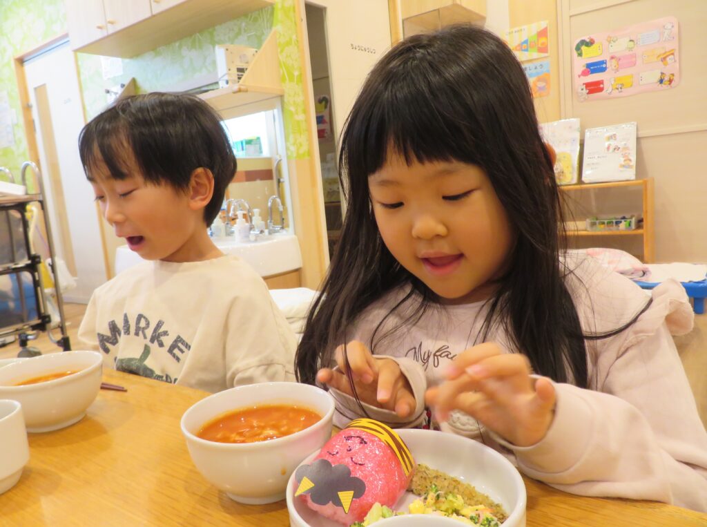 給食では、鬼の顔をした「おにぎり」や、鬼が苦手な「いわしのカリカリチーズ焼き」など、節分が感じられるメニューに子どもたちは大喜び🥰💕