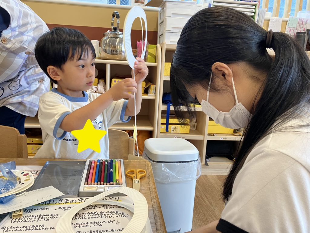 ハサミを使って星を切ったあとは、ビニールテープや紙皿を使って土台作り☆彡