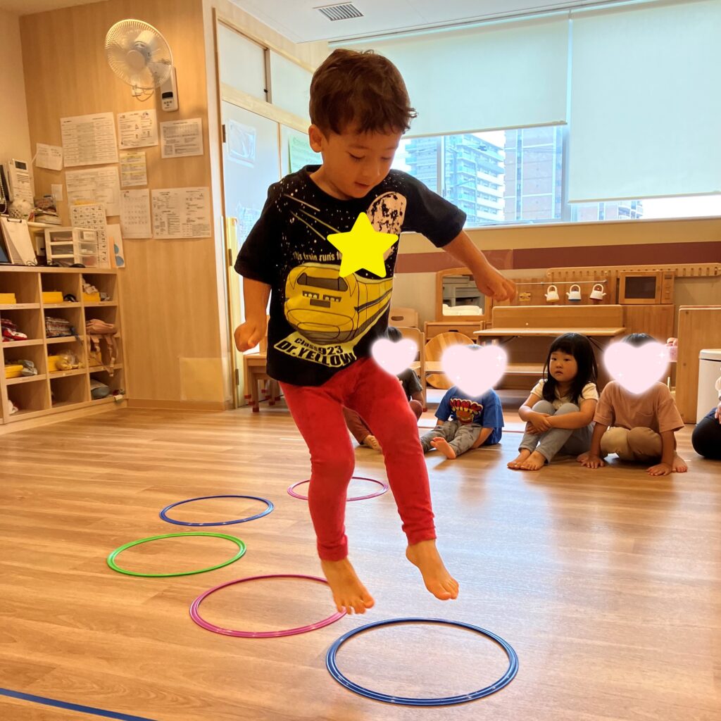 年少さんは、ボールキャッチやバランス、フープを使ったジャンプ