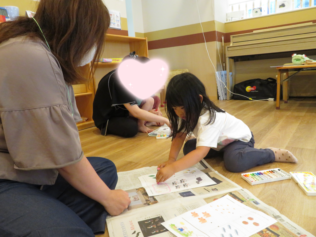 年中・年長さんはハサミを使ってカエルの顔や手足を切り、年少さんはカエルの顔を描いたり、コップにはキラキラのシールを貼っていきました✨