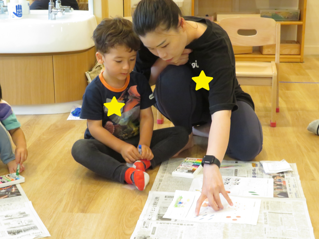 片方の指でカラーセロハンを押さえながら、もう片方の指でセロハンテープを付ける作業は、年少・年中さんには少し難しい作業でしたが、学生さんに手伝ってもらいながら貼ったり、お友だちが困っている様子を見て「ここを押さえとくから大丈夫!」と助けてあげる姿も見られ、子どもたちの成長した新しい一面を見ることができた時間でした🥰
