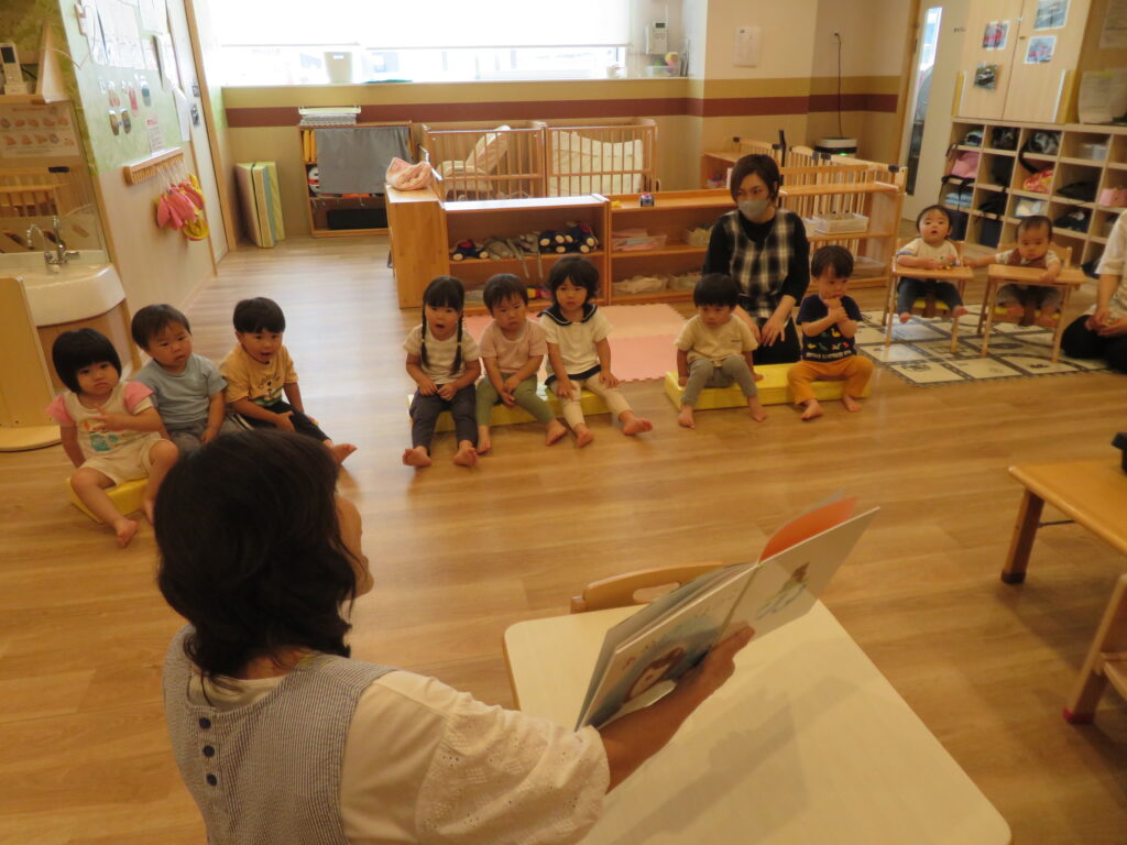 20日(木)のリトミックでは『あめふりくまのこ』の絵本を見ながら歌いました(^^♪