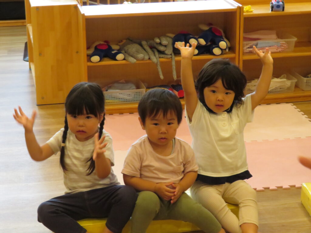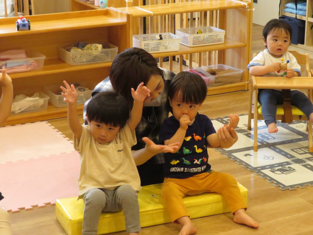 27日(月)のリトミックでは『トマトはトントントン』や『こぶたぬきつねこ』など普段の保育の中にも取り入れている手遊びが始まると、保育士の真似をしながらリズムにのっていた子どもたち🎵