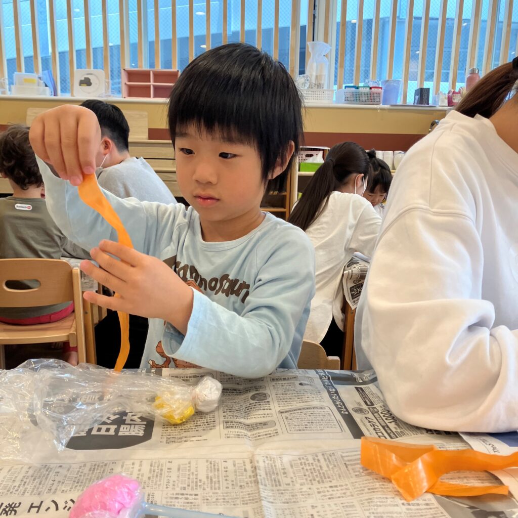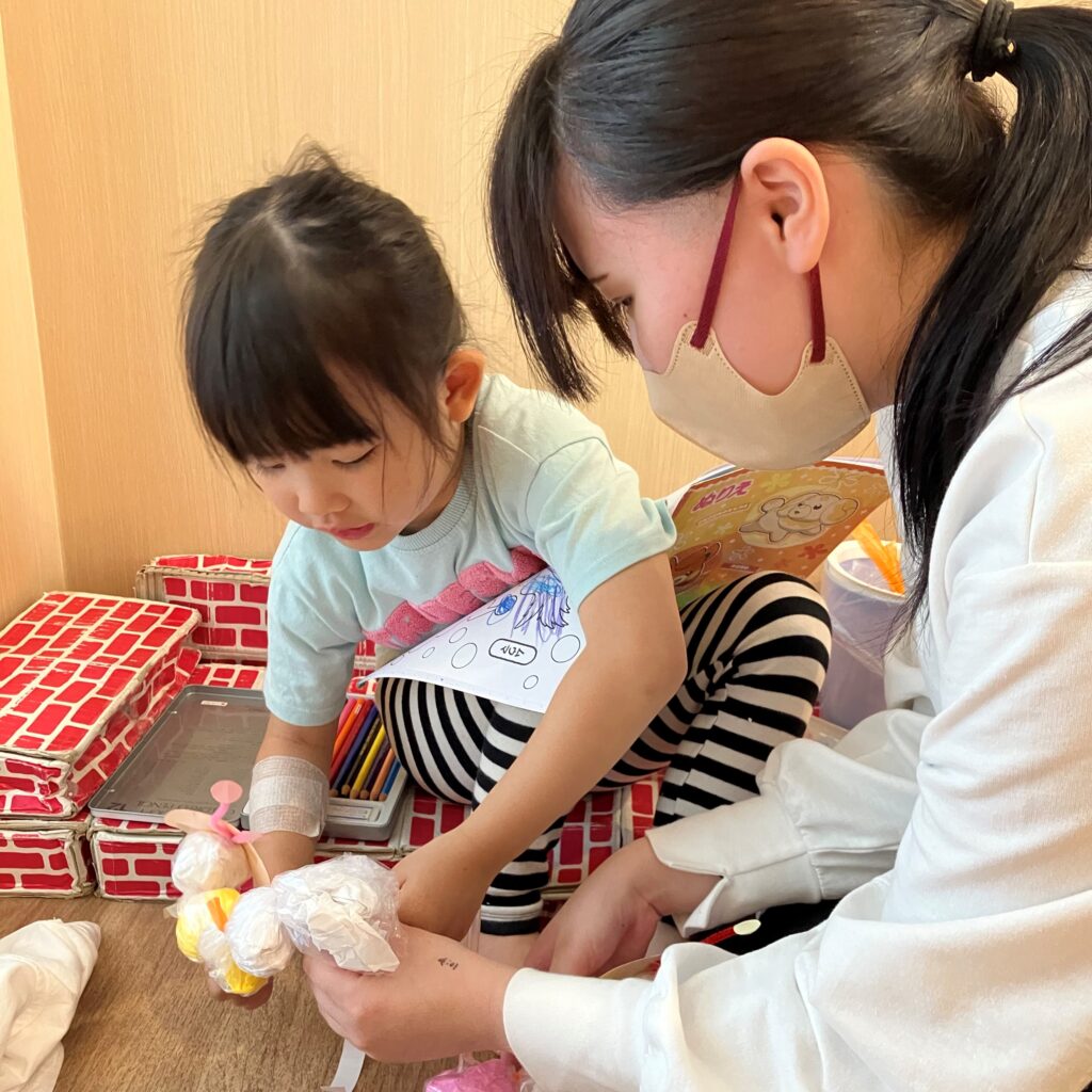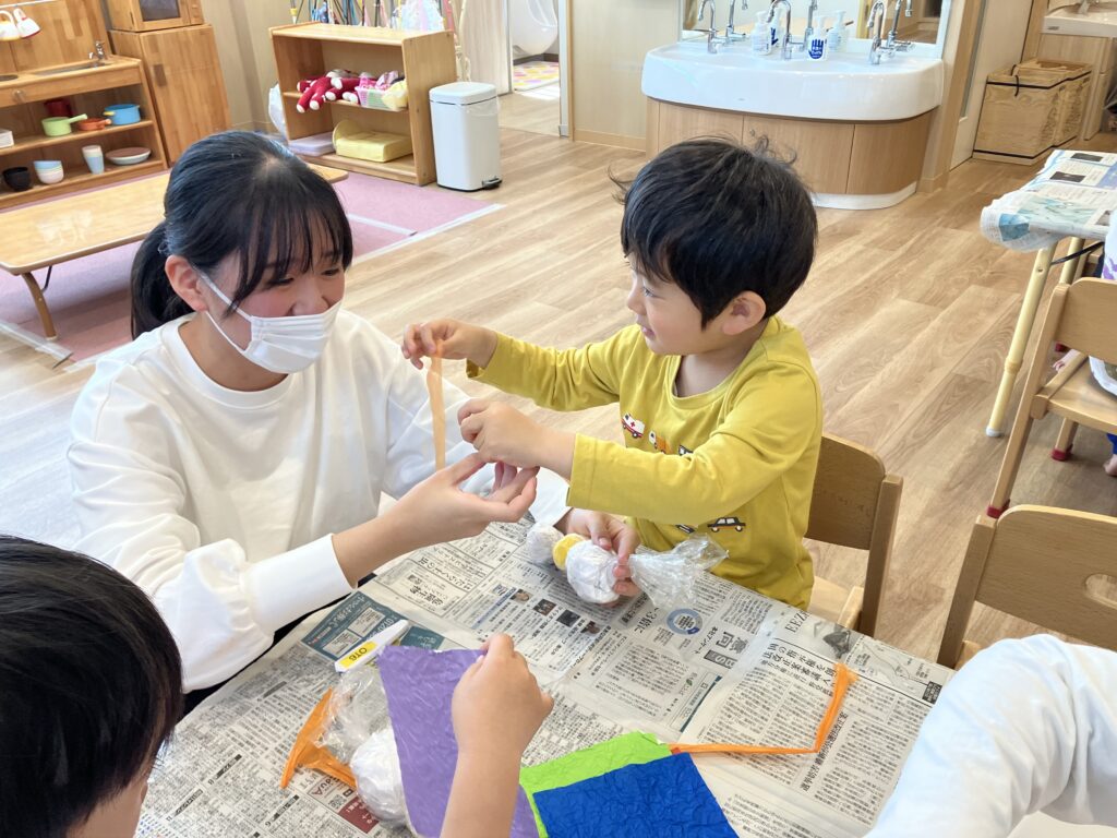 17日(金)の造形では、姫路医療専門学校 作業療法士科2年の学生さんと『クシャッっとまるめて!いもむしくん』を作りました!