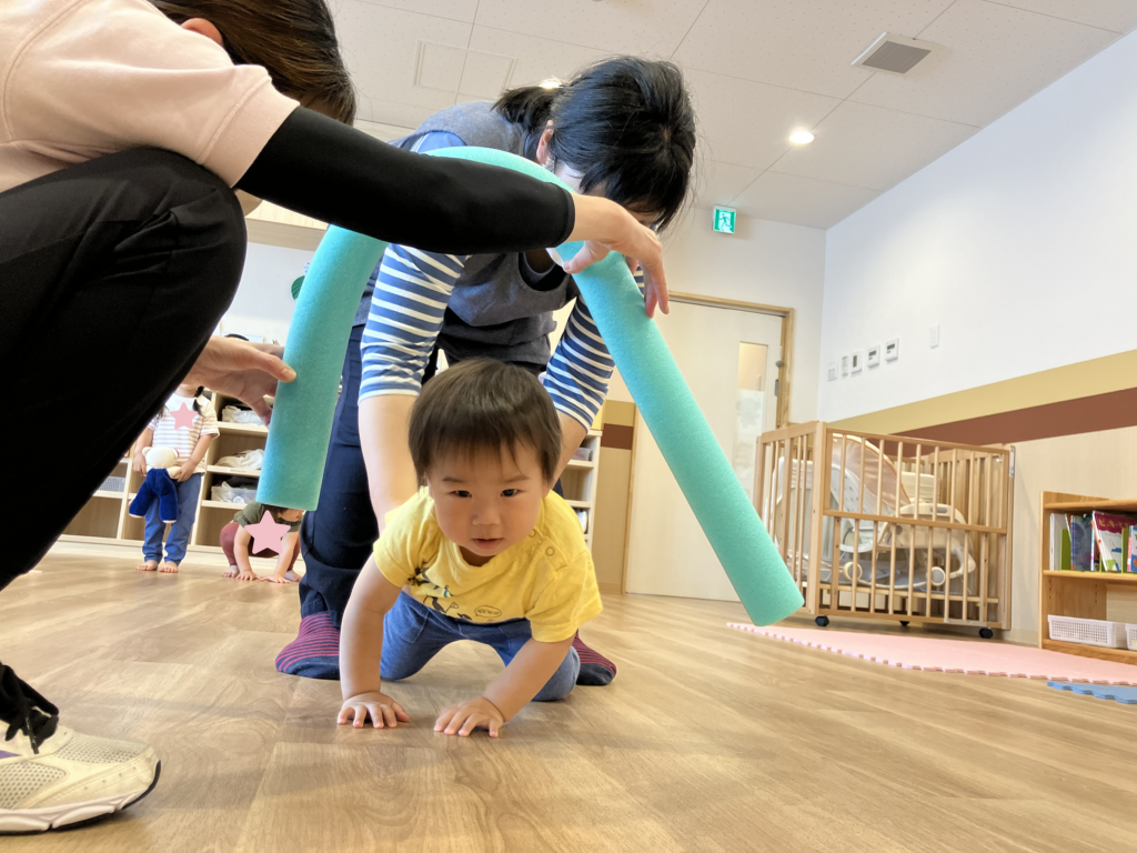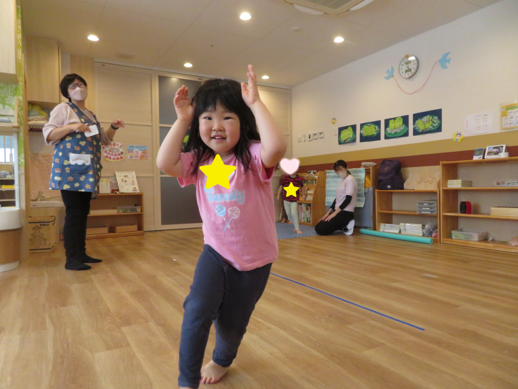 動物の真似の動きでは、楽しそうな2歳児さんの姿を見て1歳児さんも途中参加❣