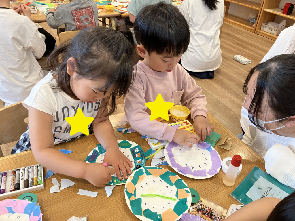 紙皿には好きな色のいろがみをちぎって貼ったり、学生さんが用意していた可愛いシールも貼りながらオリジナルの時計を作っていく子ども達✨