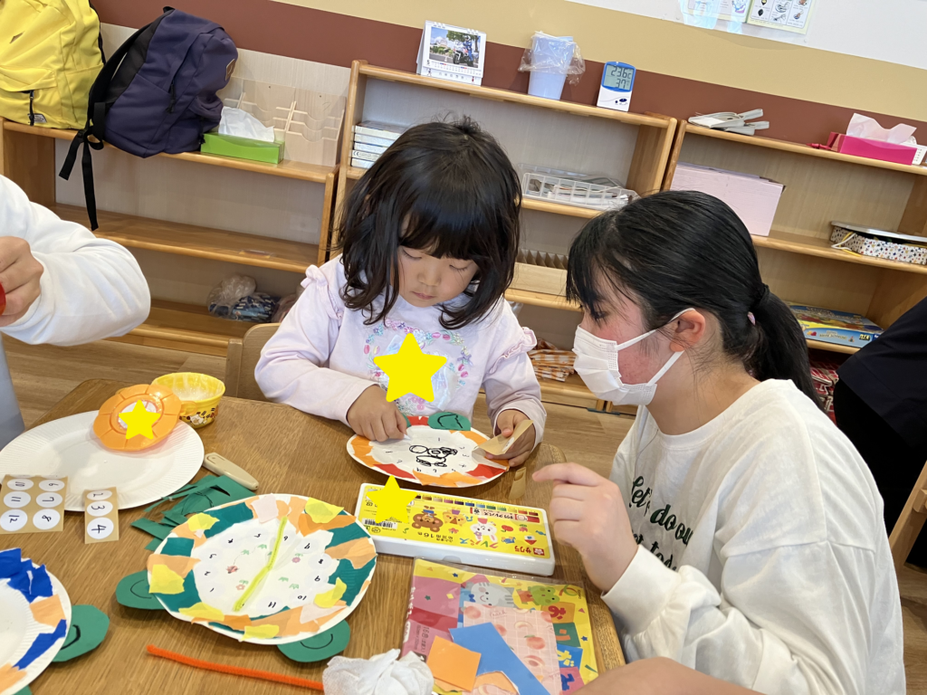 ビニール袋のスペースを見ながら「小さいのだったらもう一つ入れられるかも?」、イモムシの顔を描く時は「一緒にかわいいお顔描いて!」など、いろんな会話が聞こえてきました(●´∀`)ノ