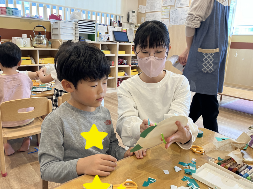 年少さんは学生さんが作ったウロコやシールを貼り、年中・年長さんはウロコの形をハサミを使って上手に切って貼りました✂