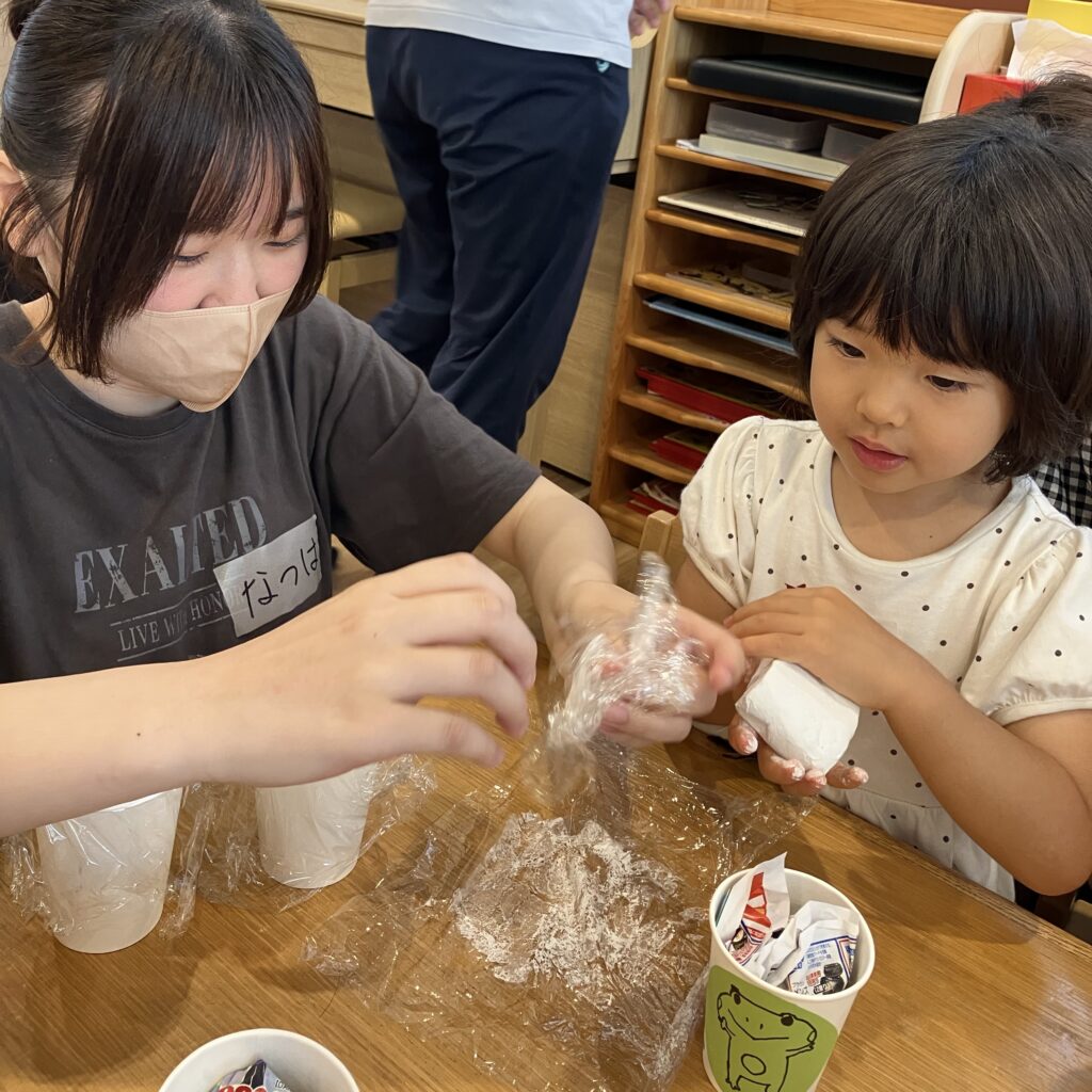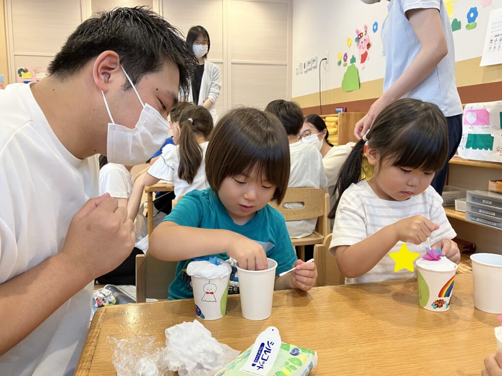 紙コップに好きな装飾用パーツをつけたり、絵を描いて出来上がったけん玉を持って、学生さんと一緒に遊びました!