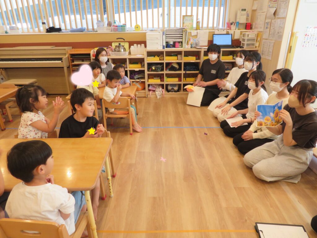 ひまわり組では、単語を動作に合わせて覚えていき天気に関する絵本を見ました!