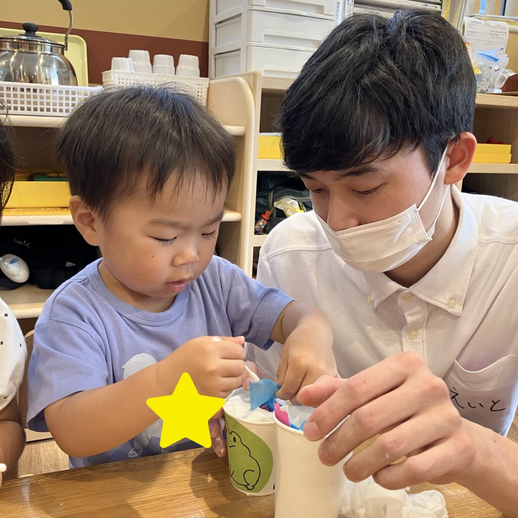 魚についているモールの輪っか部分にクリップを引っ掛けて釣る遊びは、コツを掴むまで少し時間がかかる子もいましたが、釣りの達人のごとく真剣な表情をしながら遊んでいた子どもたちでした🤣