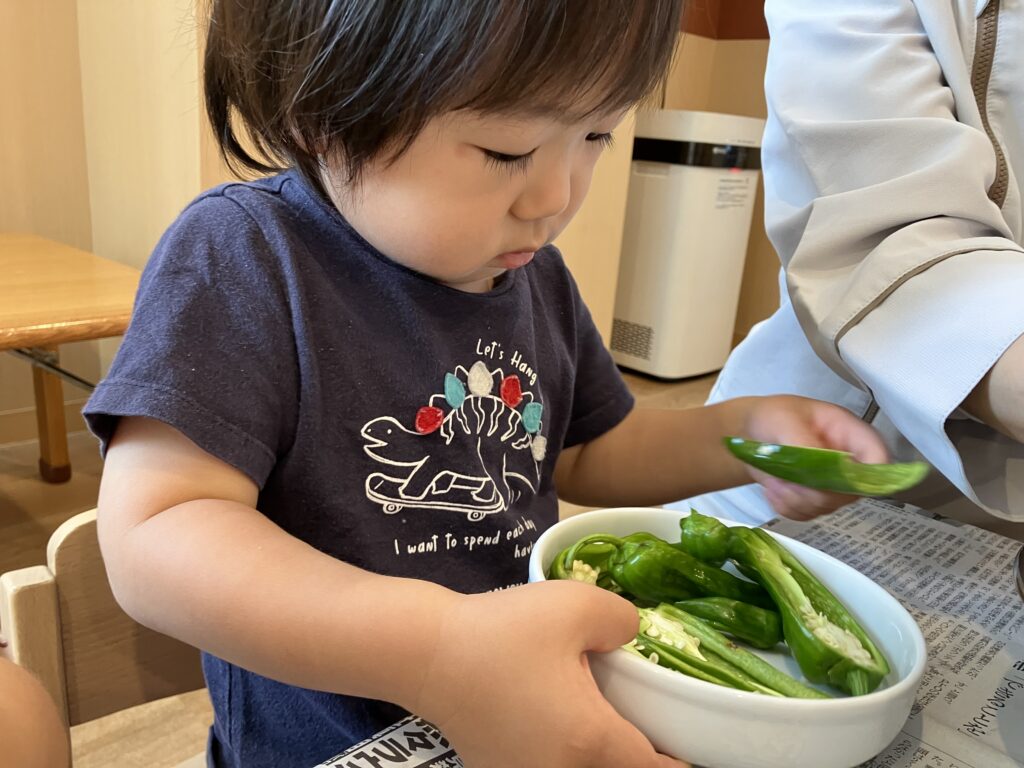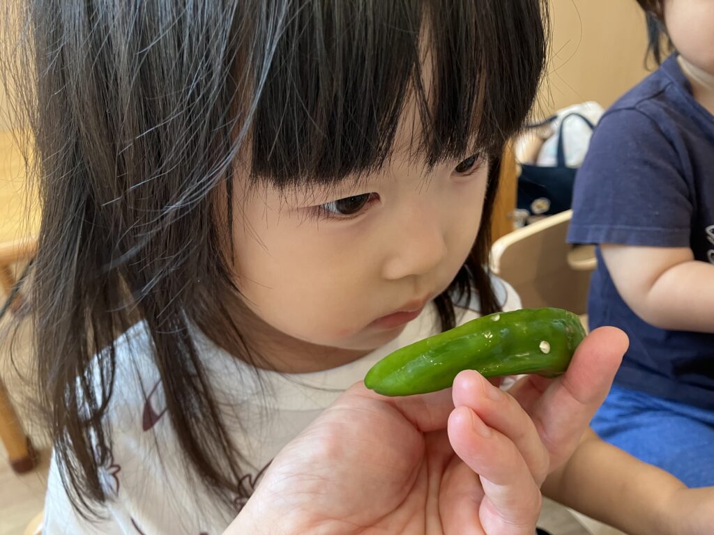 ピーマンを指さしながら「これこれ!」と言い、普段は苦手な野菜を食べていた2歳児さん!