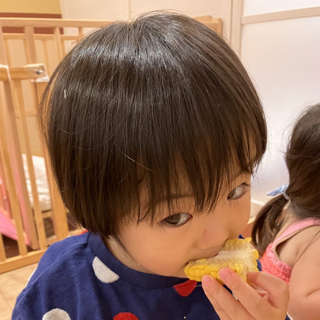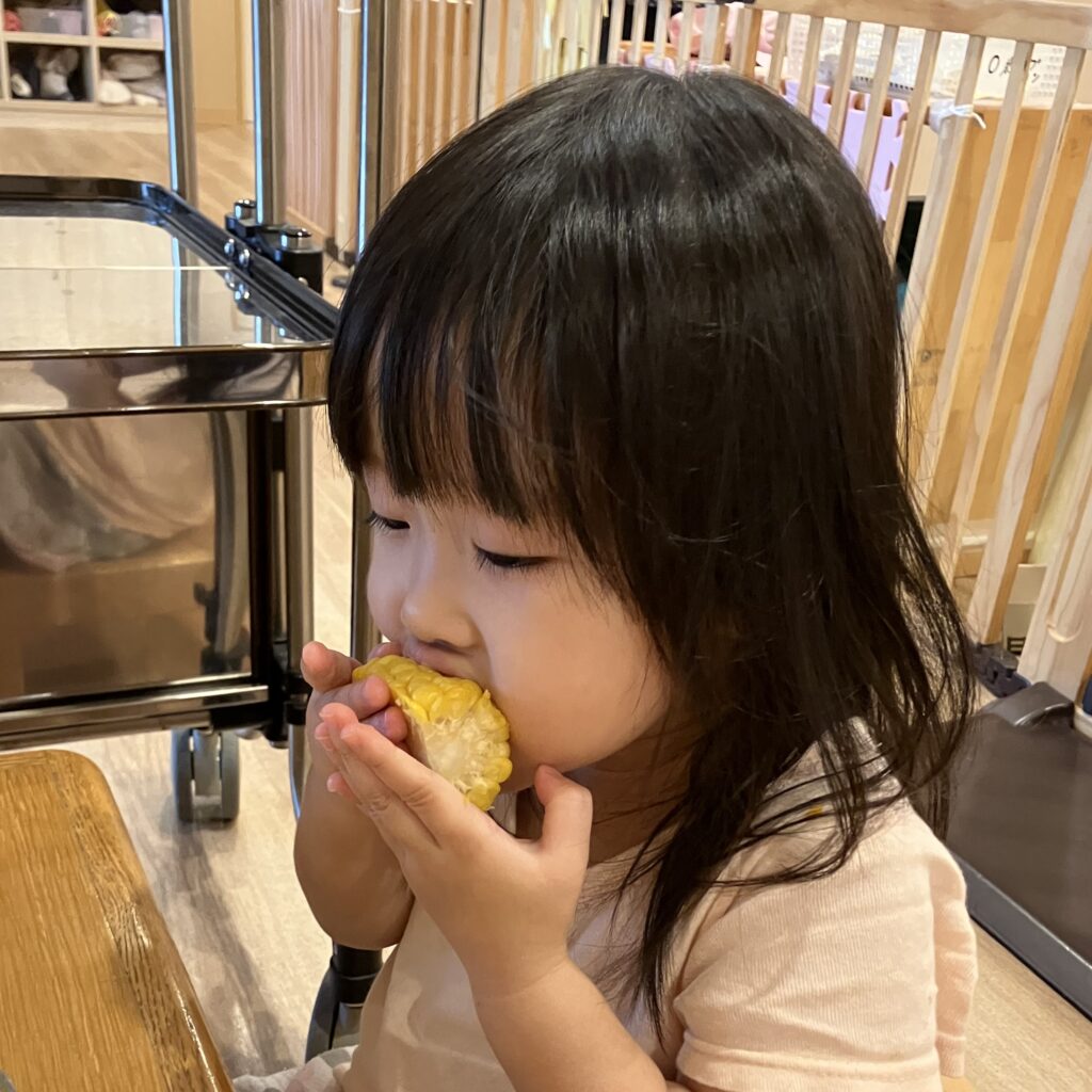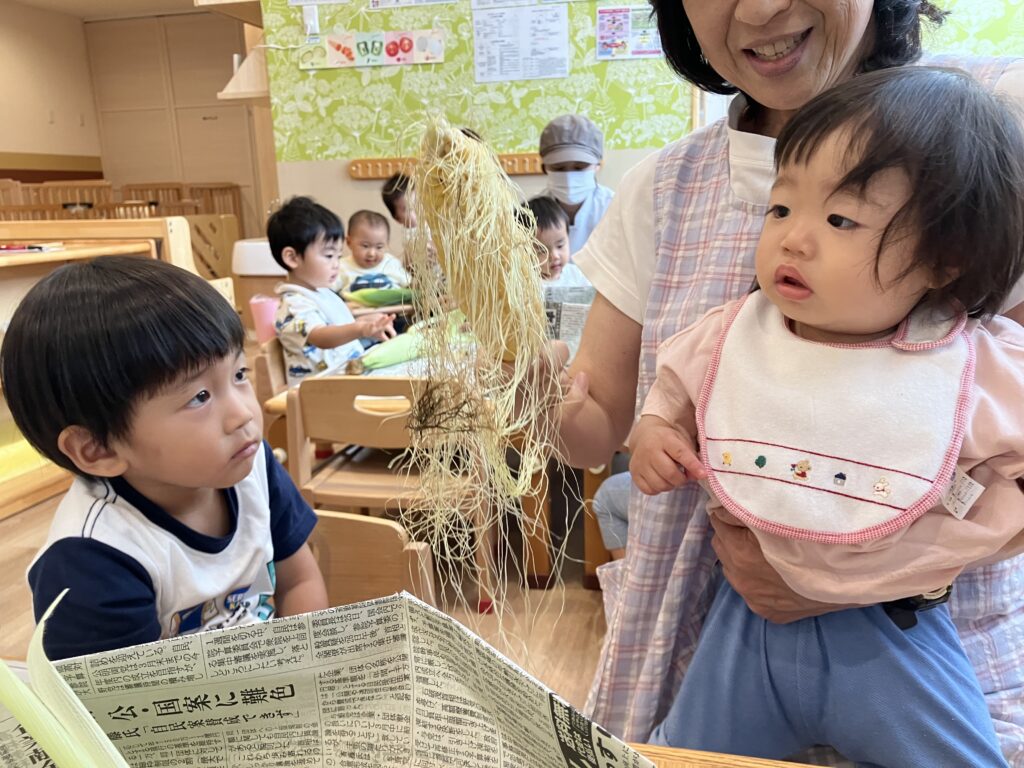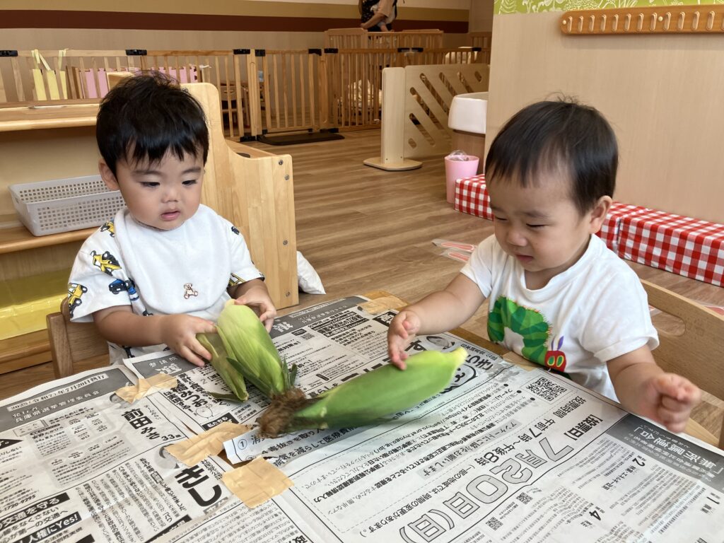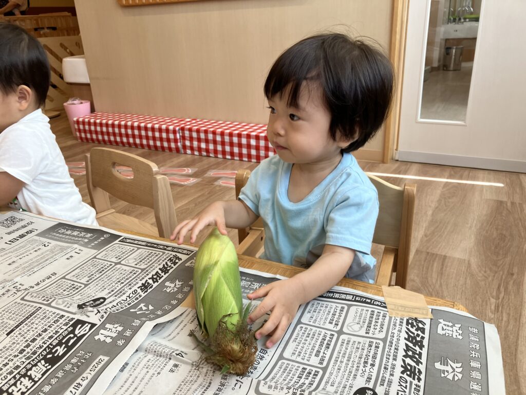 皮付きの大きなとうもろこしが出てくると「なにこれ!?」というような表情で少し怖がっていたさくら組さんでしたが、給食の先生から皮のむき方や特徴について教わると、じーっと観察したり、少しずつ触ることができるようになってきました♪