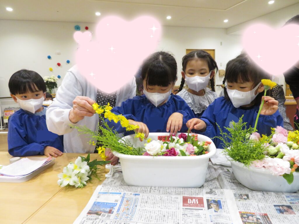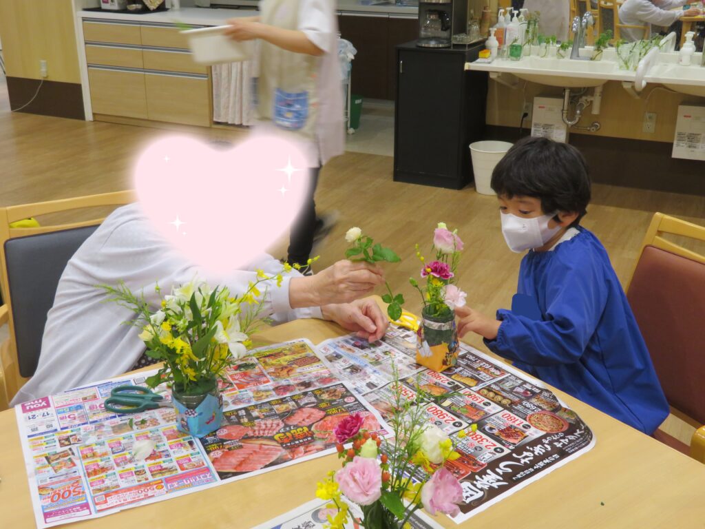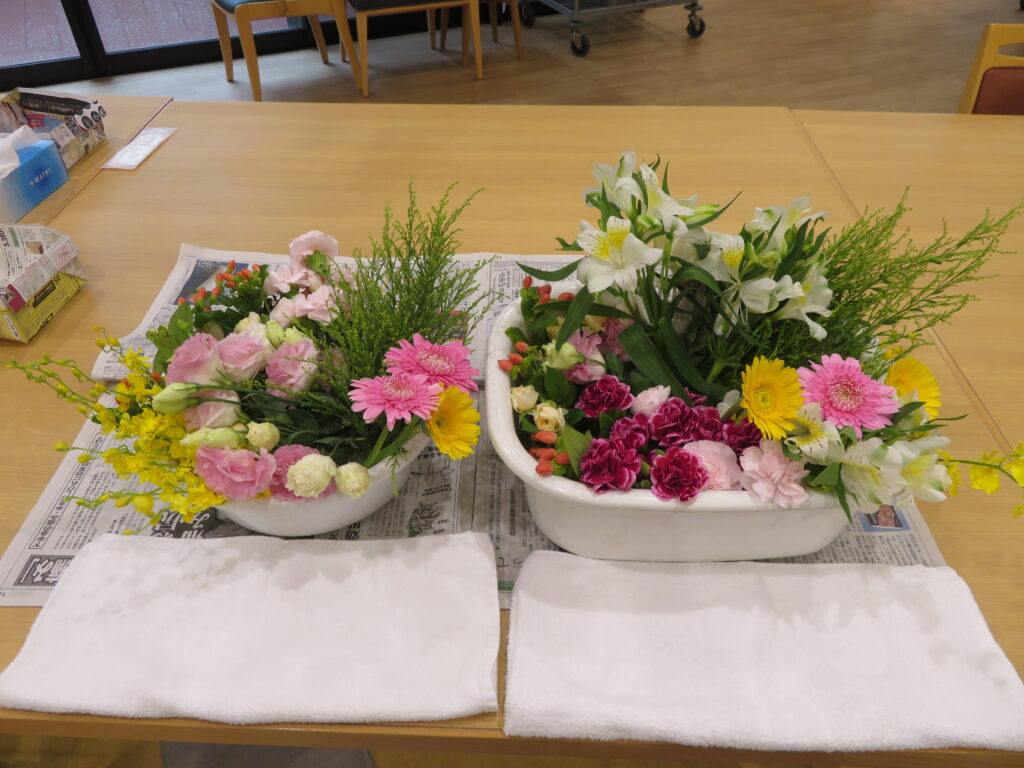 沢山のお花を選ぶ時には「このお花きれいね~」「空いているところにこのお花も入れたらいいよ~」と利用者さんとお話をし、一緒に考えながら素敵な生け花が完成☆