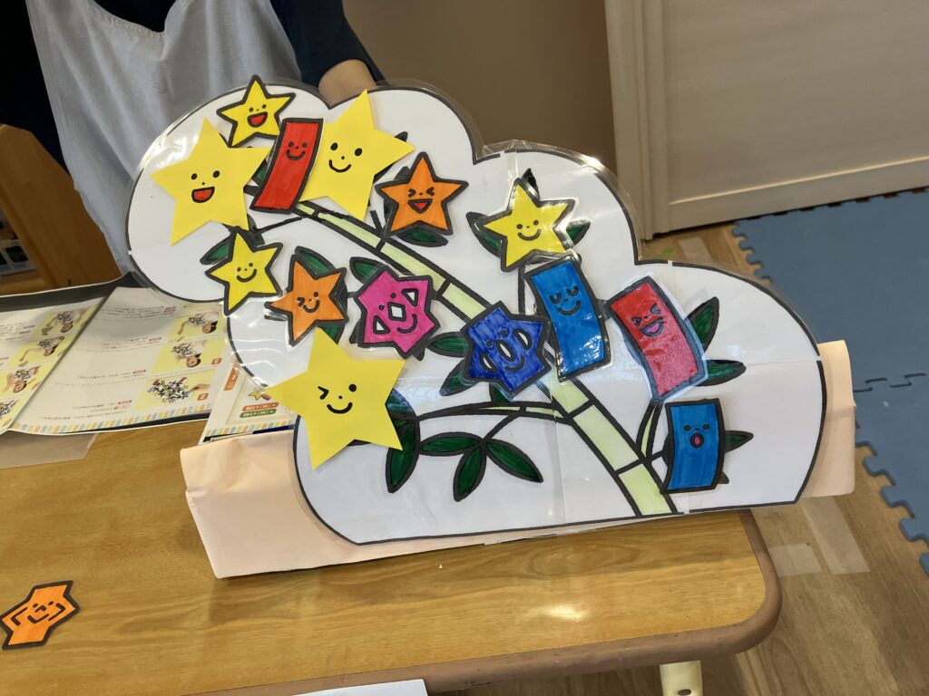 ひまわり組では、ペープサートを見ながらみんなで『たなばたさま』を歌い、飾り付けを完成☆彡