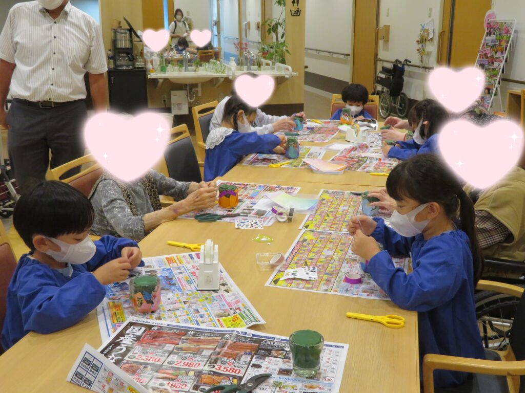 「キラキラのテープもあるよ!」「ありがとう!」など、とても楽しそうに話しながら装飾をしている利用者さんと年長さんの姿を見てほっこり💕