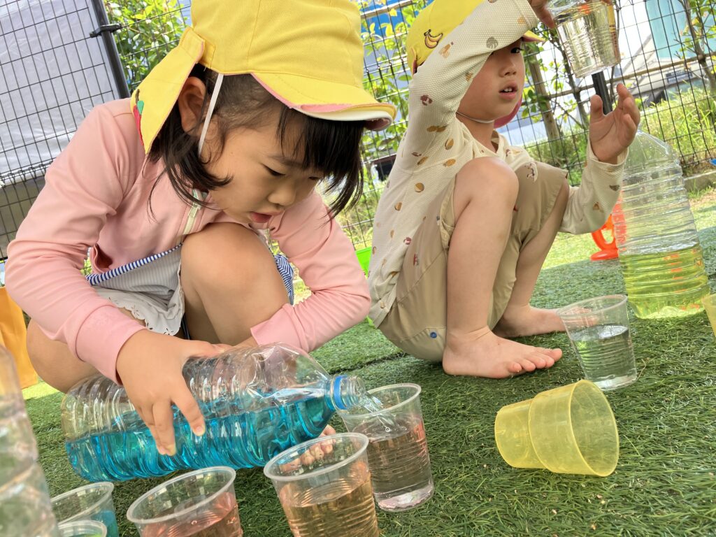 容器を揺らして混ざってしまわないようにそ~っと色水を入れて観察していました♪