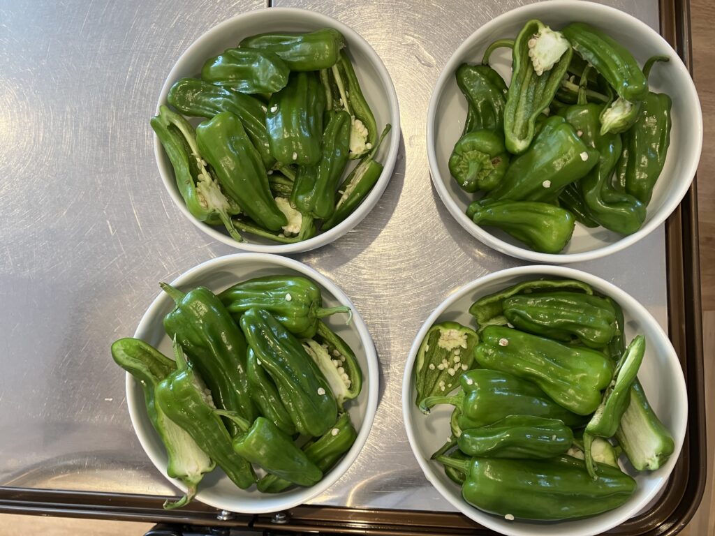 お皿いっぱいのピーマンを見ながら、給食の先生に種の取り方を教わりコツを掴むと、黙々と取っていく子どもたち!