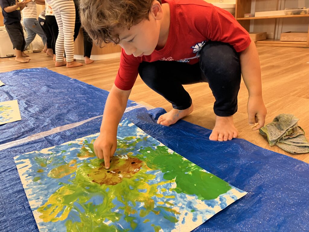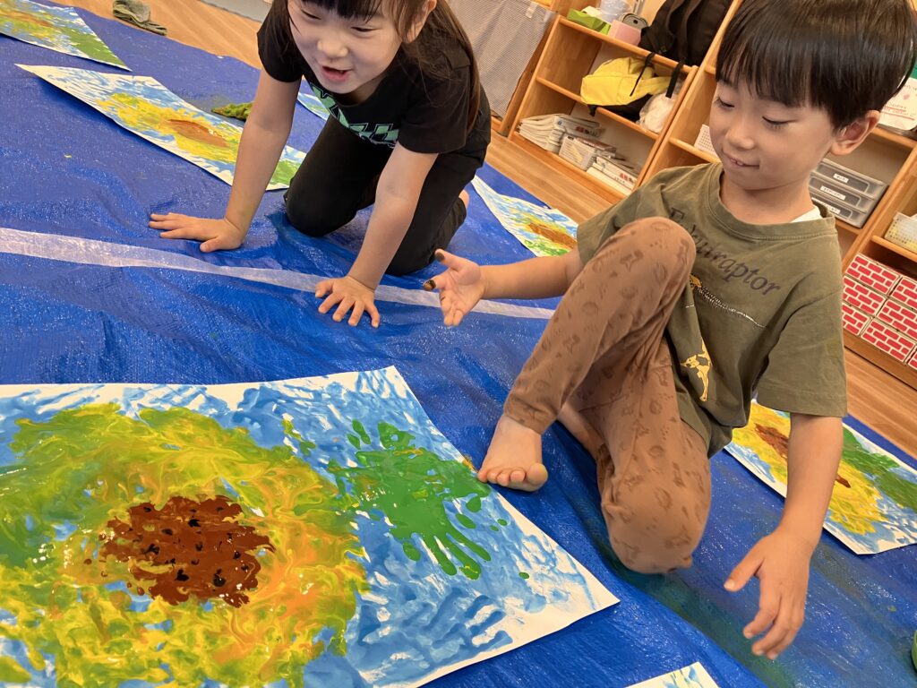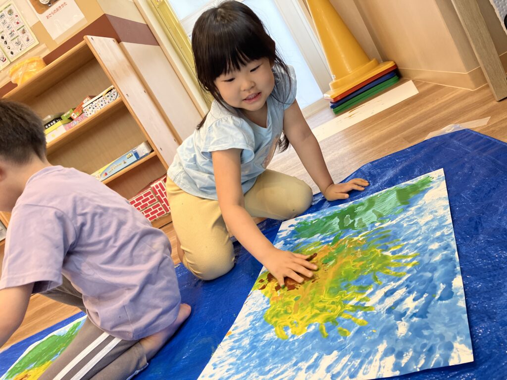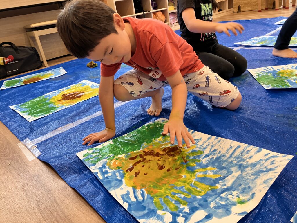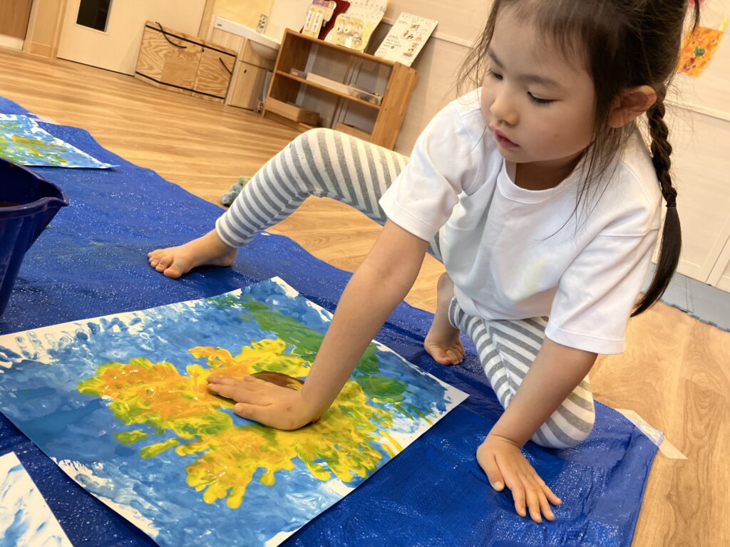 自分の手を使ってひまわりを描くことに大興奮のひまわり組さん♪