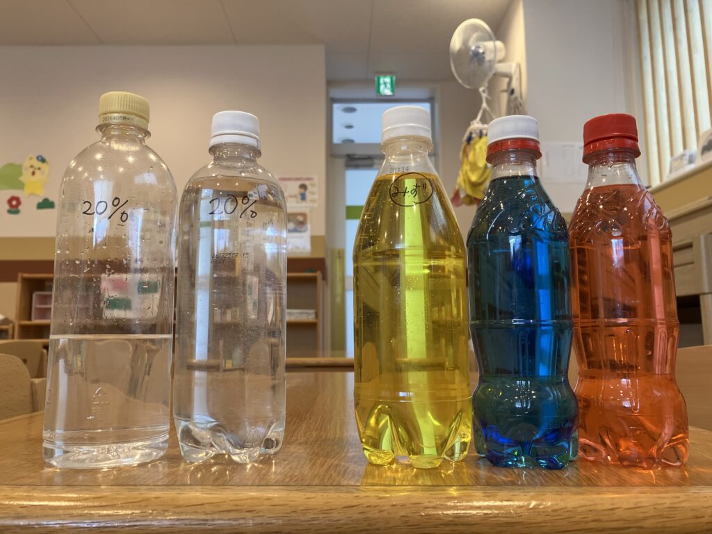 「じかんがたつとどうなるかな?」「ふるとまざっちゃうかな?」と、実験後の様子にも興味を持っていました!