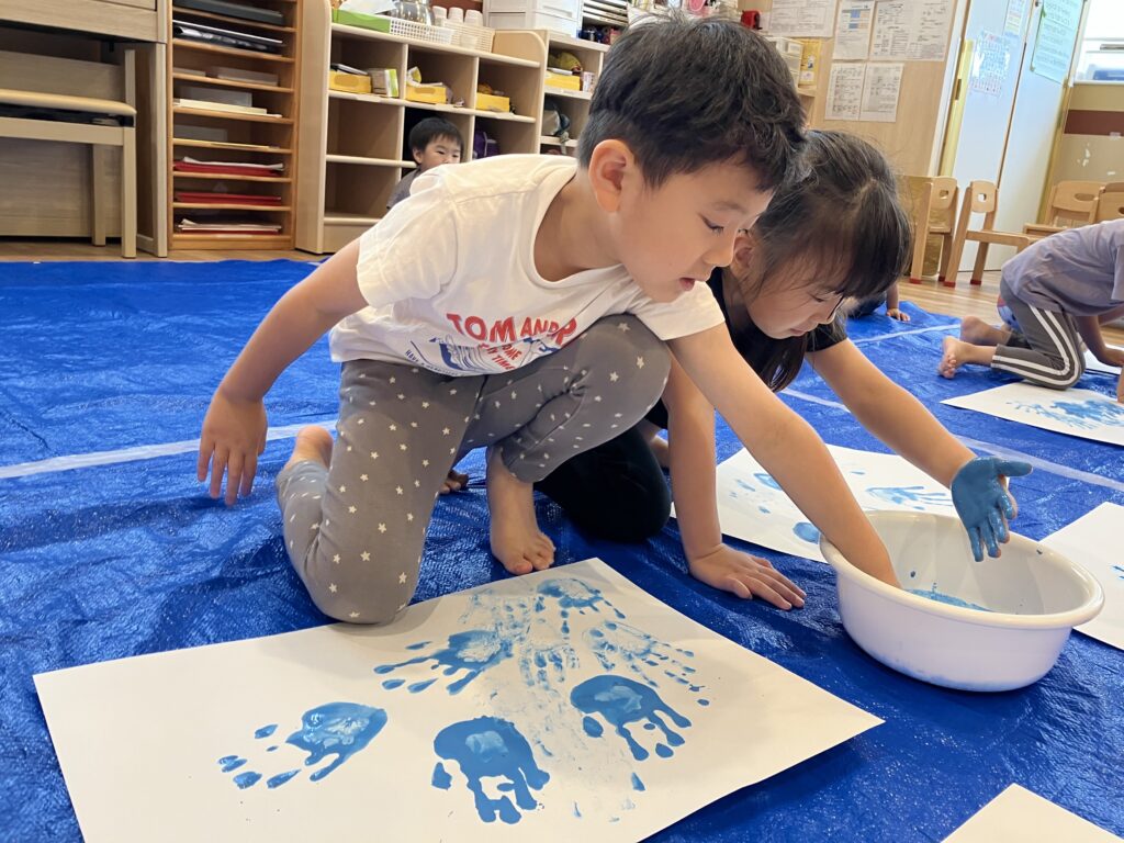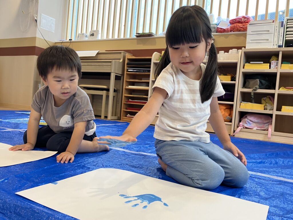 絵の具を手につけて画用紙に手形を付けると「おぉ~…」と嬉しそうな表情に(˙˘˙)✨