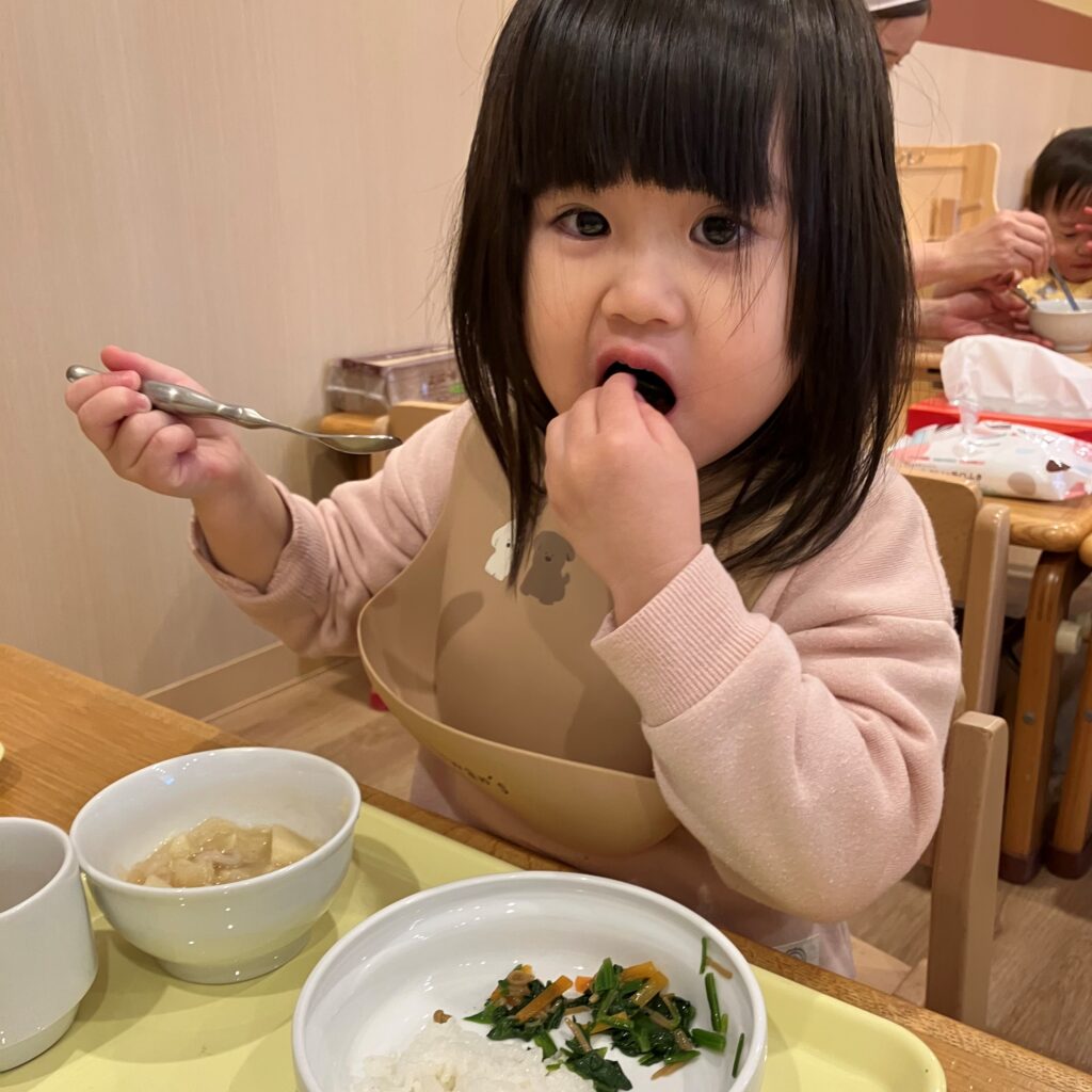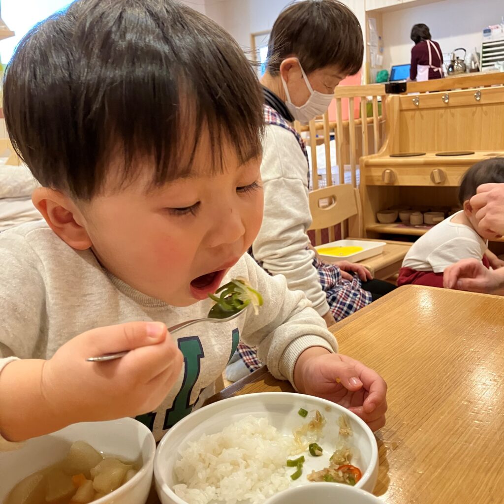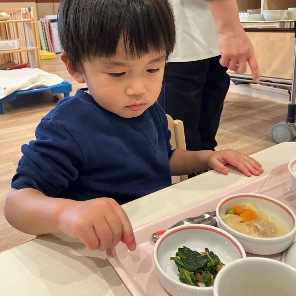 ほうれん草のおかずをみつけると「これ、きれいきれいしたの~!🤩✨」と、自分たちがお手伝いしたほうれん草を嬉しそうに見たり、1番に食べたりと、普段よりも興味を持っていた1歳児さんでした♡
