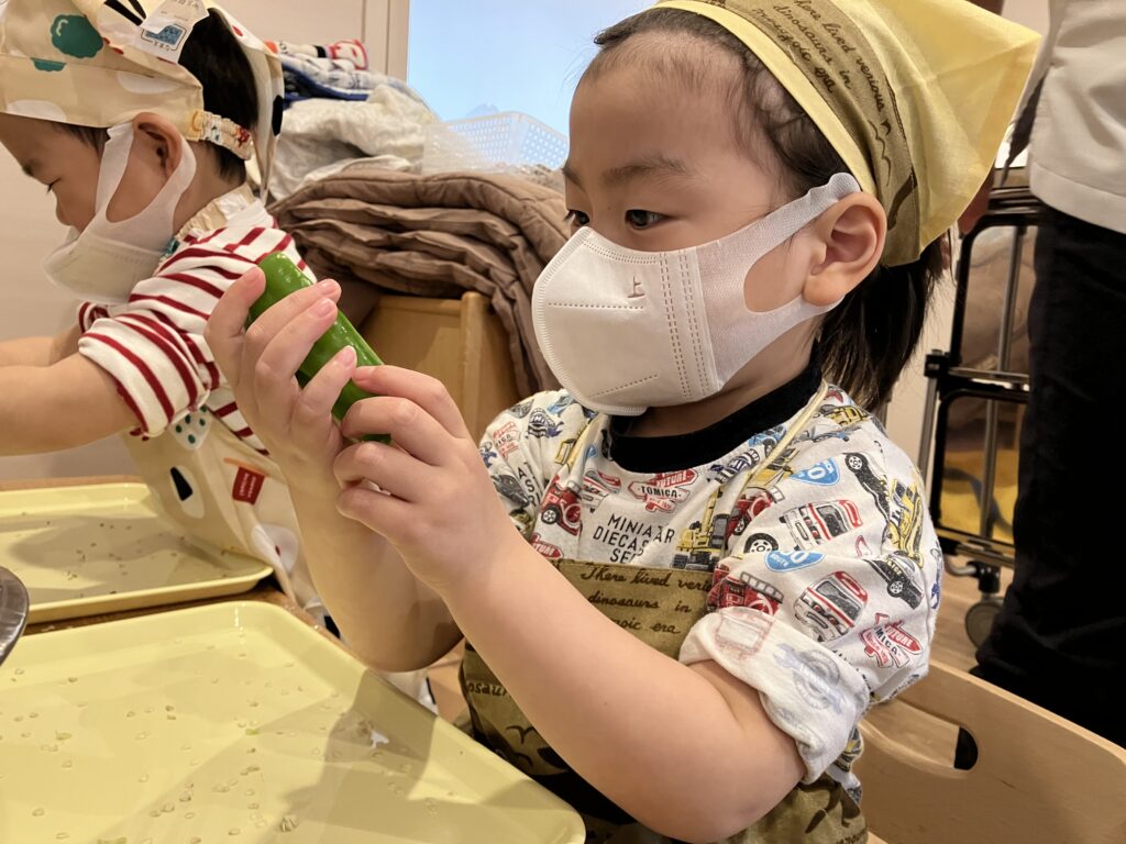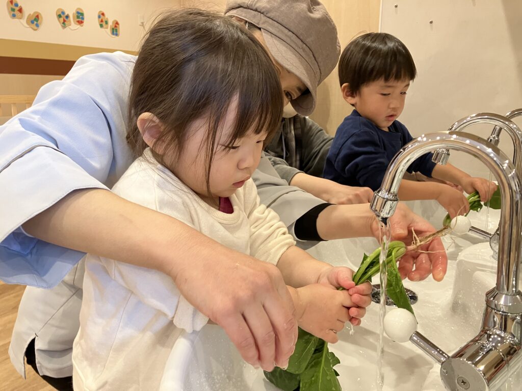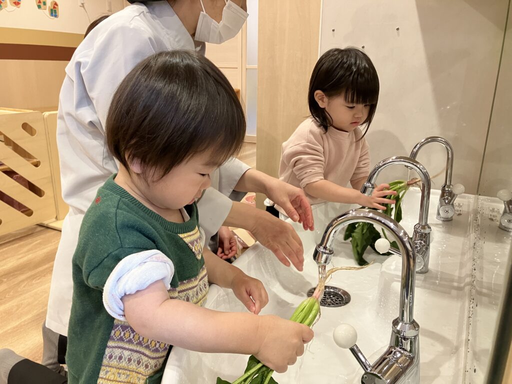 1歳児さんは、かぶの葉の部分を指さしながら「キレイキレイしたね~!」と、以前ほうれん草を洗ったことを覚えていました😊