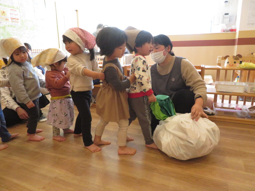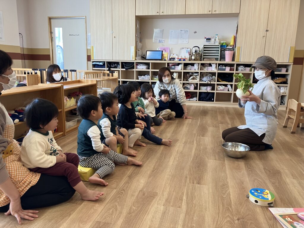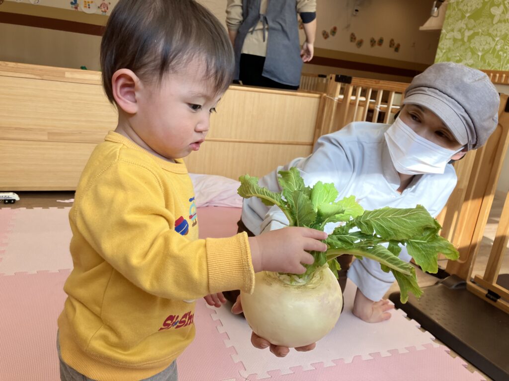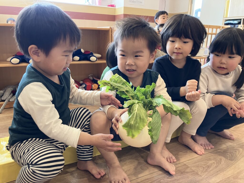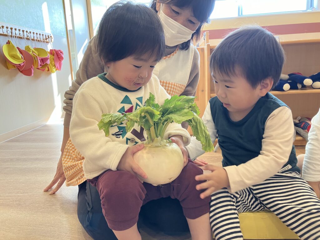 実際に持ってみると「つめた~い!」「おもたい!!」など、先生とかぶの感想をお話ししていた子どもたちでした🤗