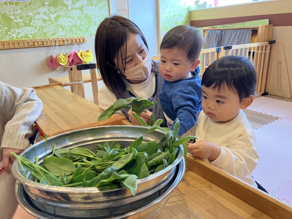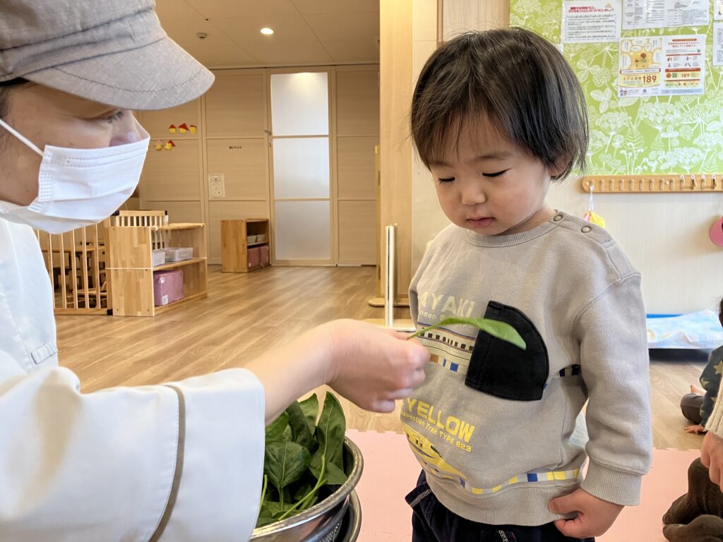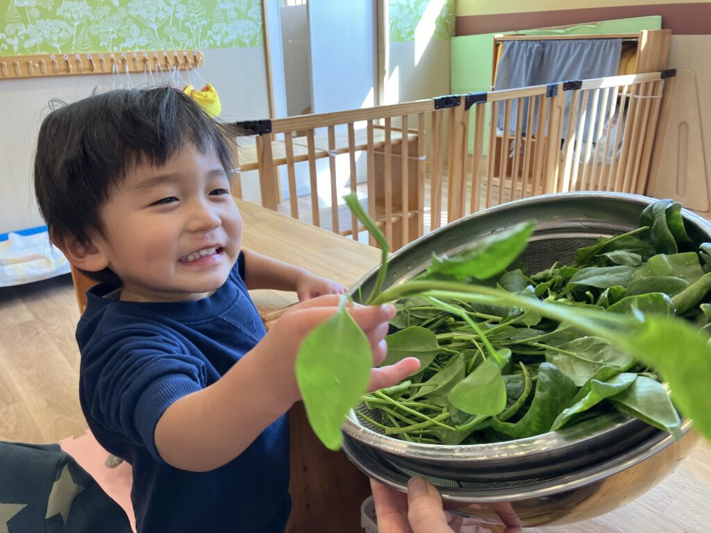 ひまわり組のおにいちゃん、おねえちゃんが園庭でほうれん草を育てている様子を見ていることもあり、ボウルに入ったほうれん草を見た時は、抵抗なく観察していました♪