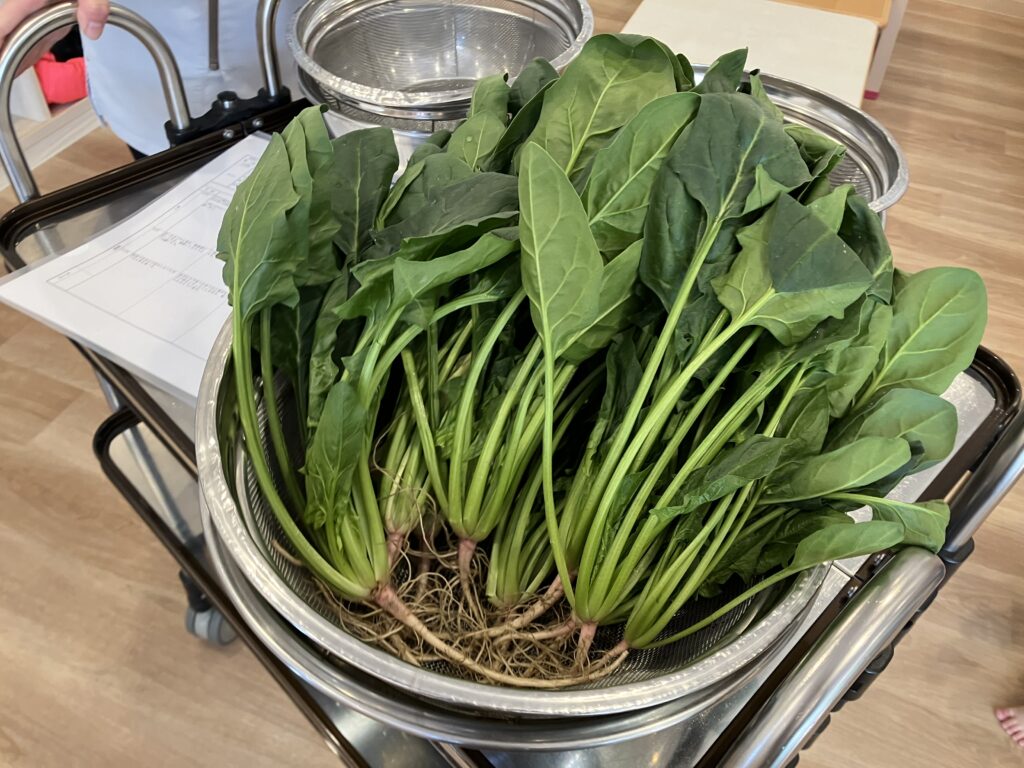 6日(木)に収穫したほうれん草をすぐに給食室で洗ってもらい、みんなでクッキング♪