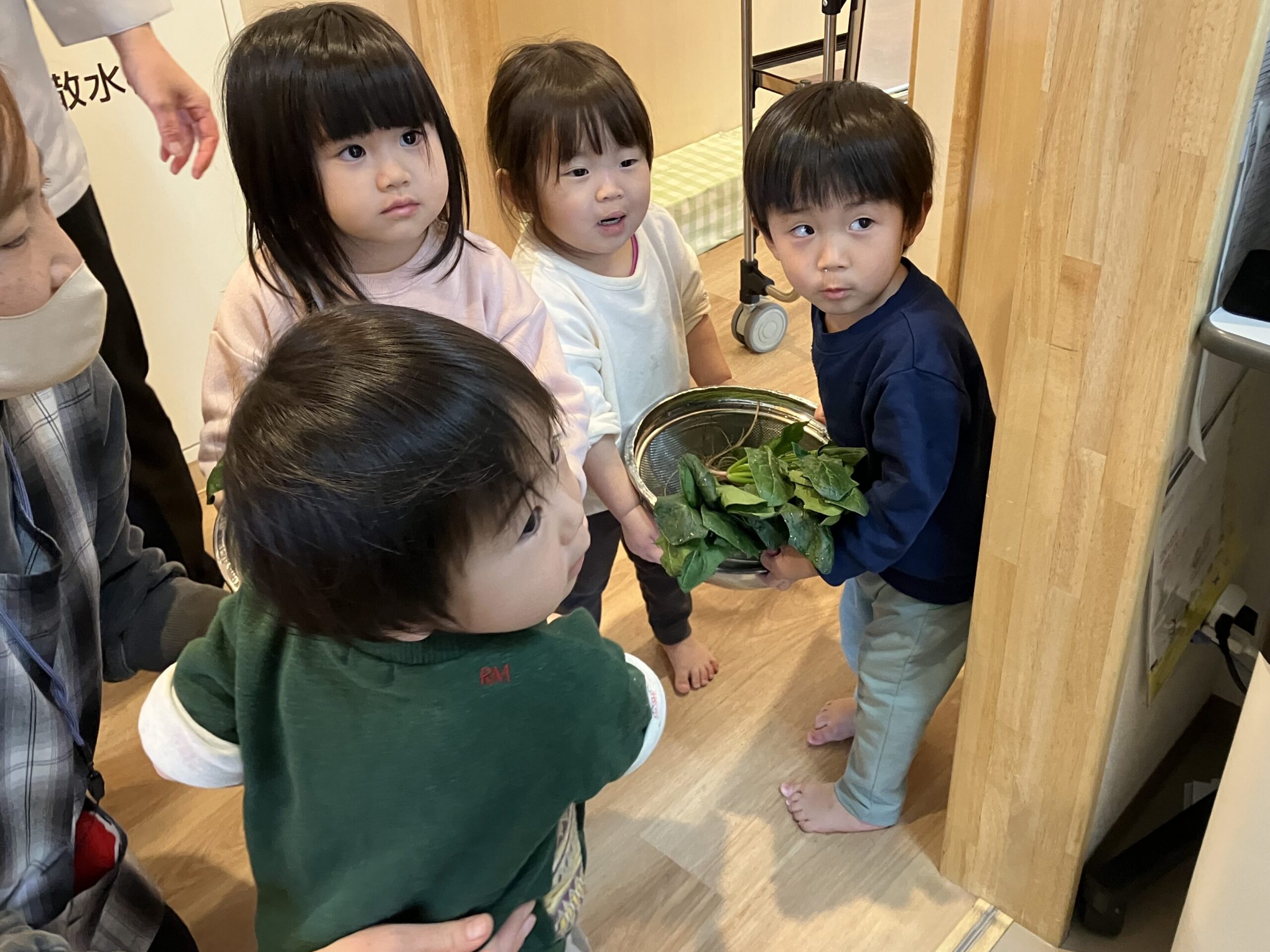 そこで少しでも興味を持ってもらえるように、13日(木)に『お手伝いの日』として、1歳児さんにほうれん草を洗ってもらうことにしました!