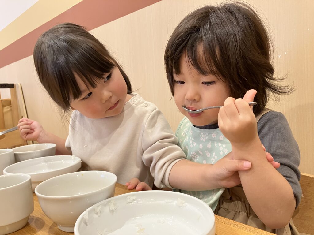 仲良しのお友だちパワーでパクッと食べてみると「美味しい…」と、自分で3つも食べていました👏