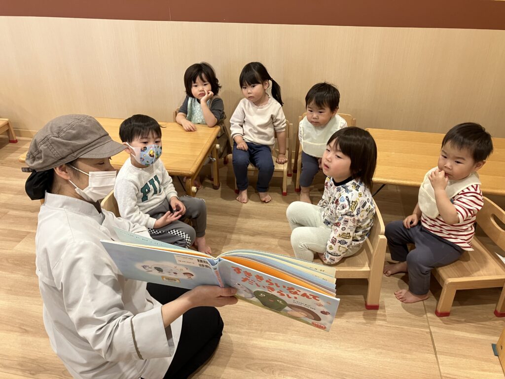 絵本を読み終えて「みんなピーマン食べれるかな?」と聞かれると「食べる!」「やだ!」と色んな回答が…🤣