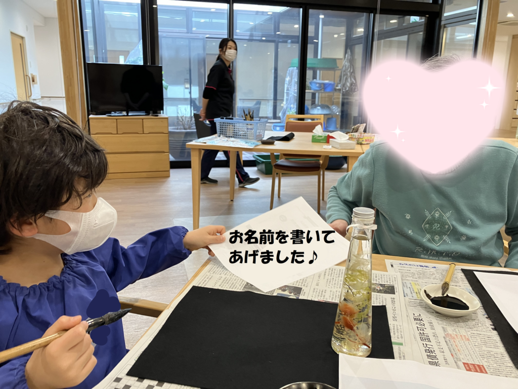 今回は『あいうえお表』や『ひらがなカード』を持っていき、好きな文字や出たカードの文字を書く子、利用者さんのお名前を聞いて書いたあとにプレゼントしている子など、新しい楽しみ方をしていた年長さん🥰