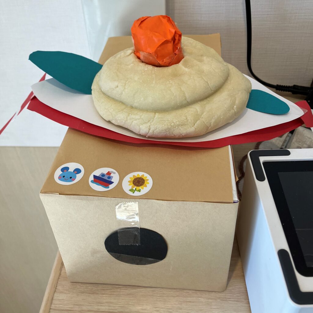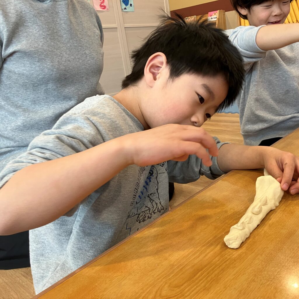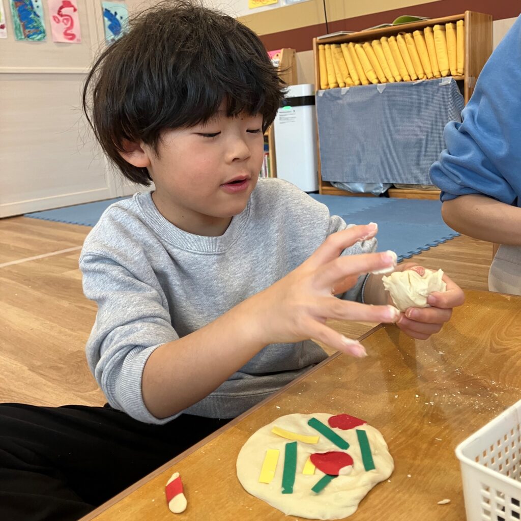 黒いいろがみで巻いた『磯部餅』以外にも、赤色や緑、黄色のいろがみを切って『ピザ風』にしたり、ピンクや黄色のお花紙をまぶしたり、好きな生き物の形にしたりと、作っていくうちに沢山の発想が出てきた子どもたちでした✨