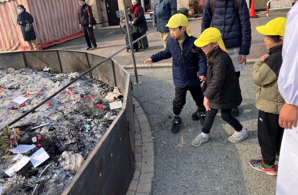 総社の方が子どもたちに声を掛けてくださり、燃えやすいようにと炎の位置を移動してくださったので、みんなで作った餅花や、お正月飾り、書き初めなどを入れました♪