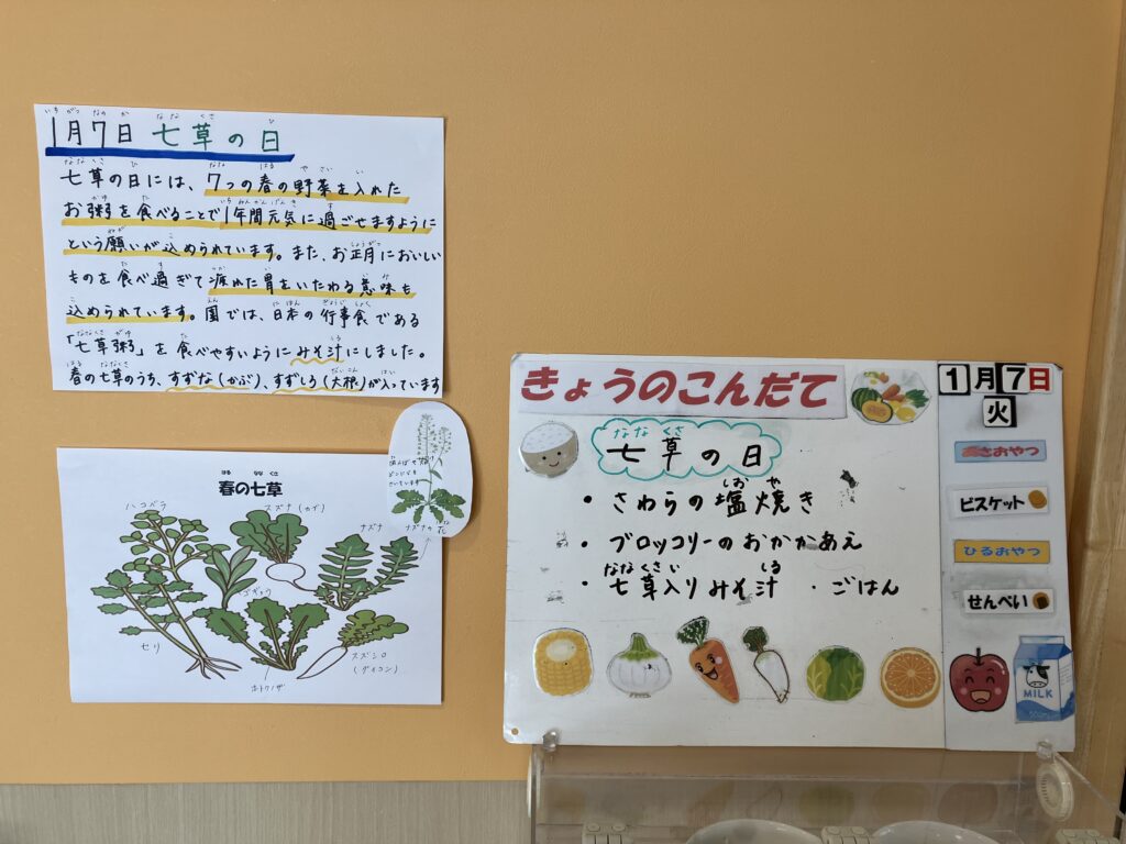 1月7日(火)は『七草の日』ということで、給食では子どもたちが食べやすいように「すずな」「すずしろ」をお味噌汁に入れてくれました♪ヽ(*´∀`)ノ