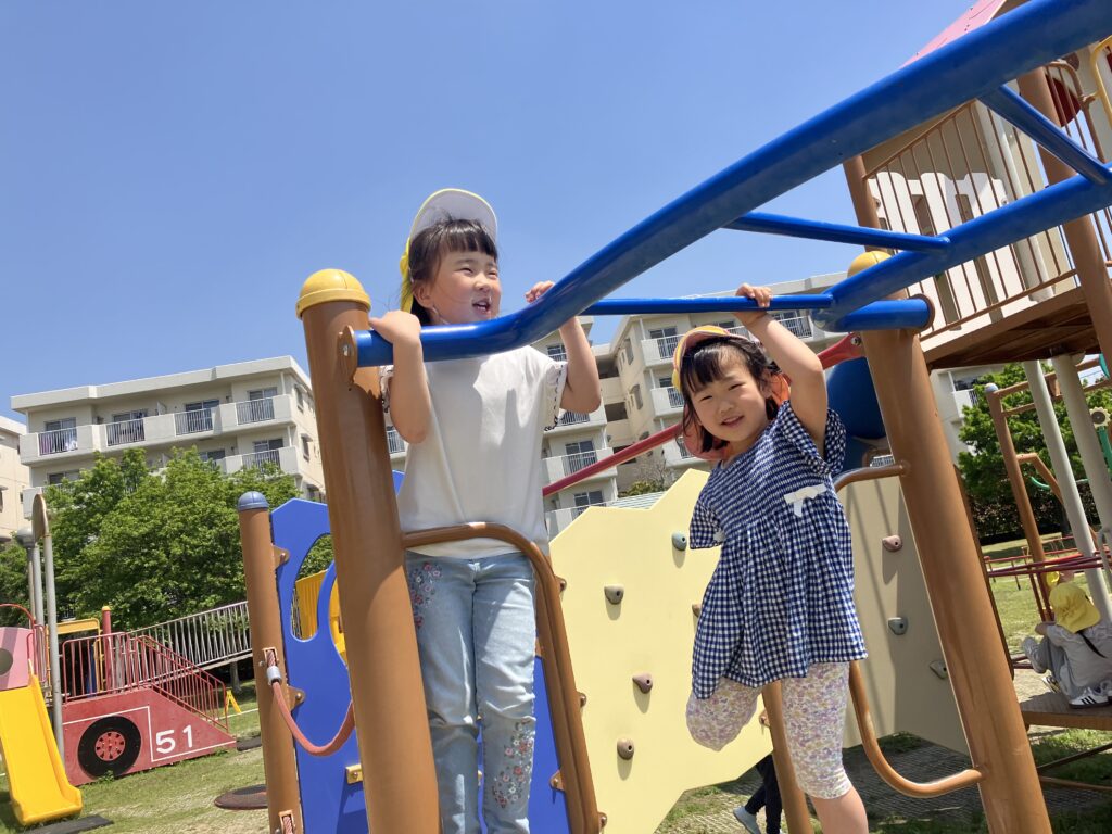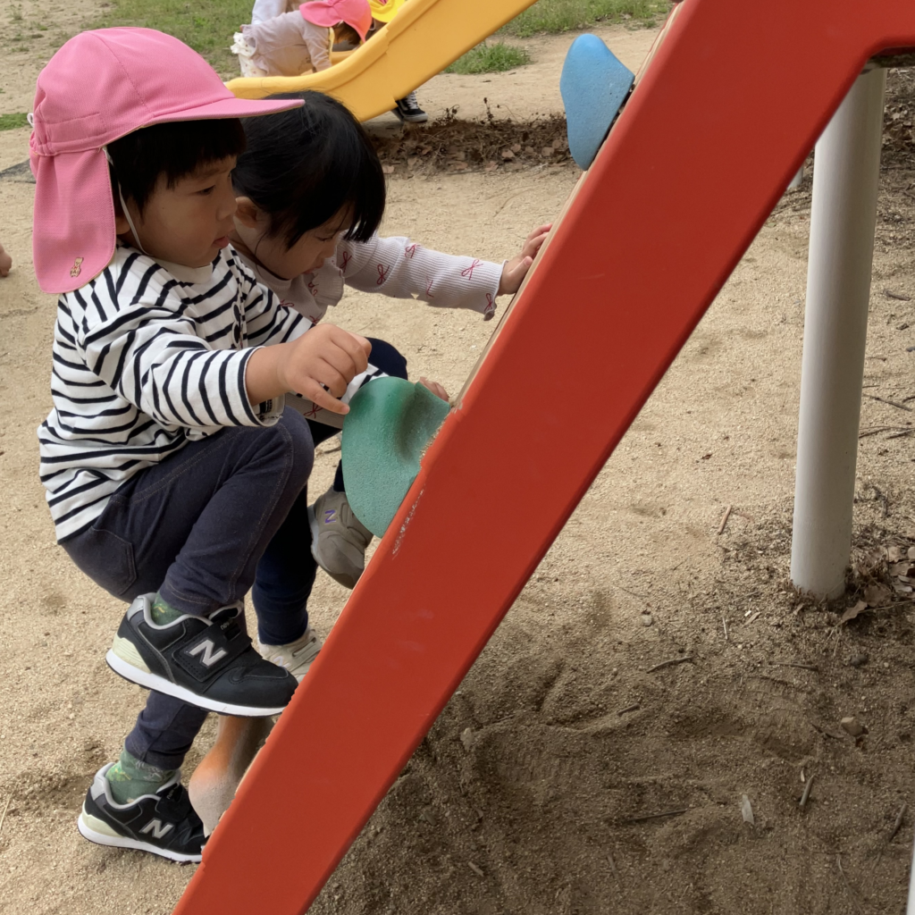 筋力がついてきた2歳児さんは、今までは少し難しかった遊具にも積極的に挑戦!