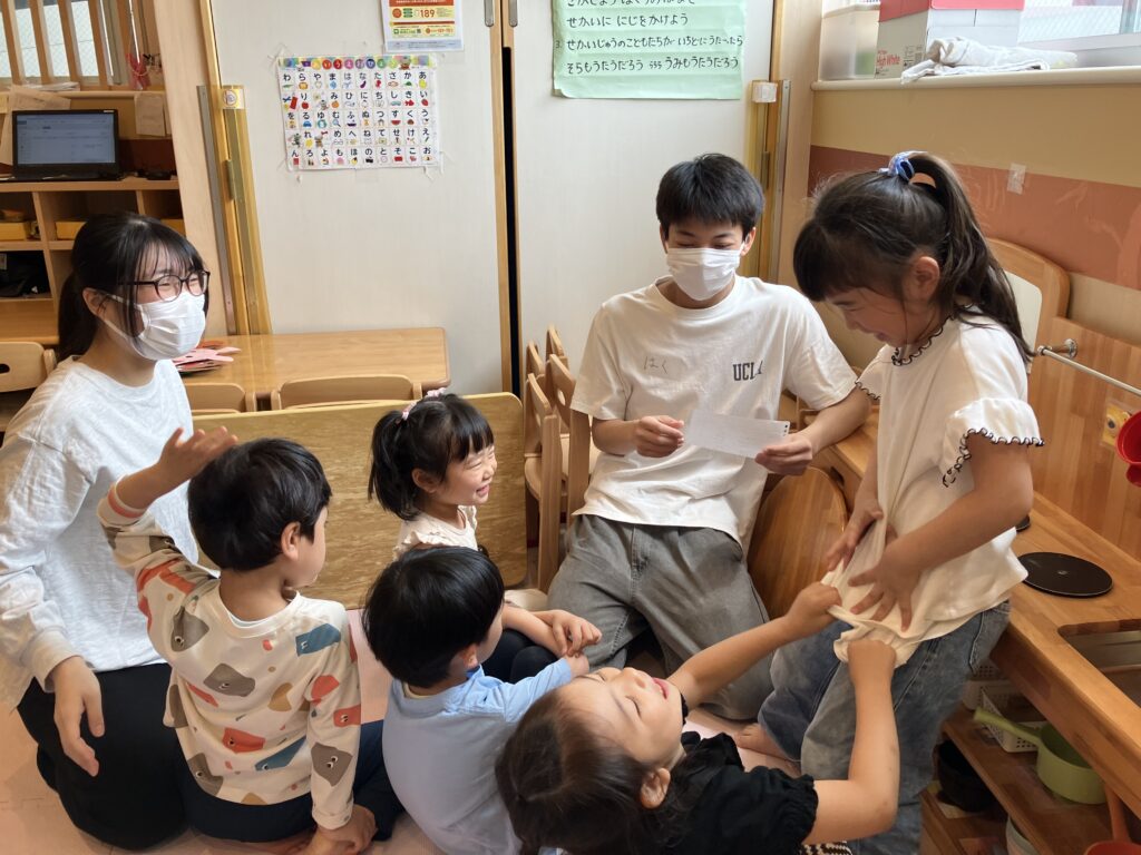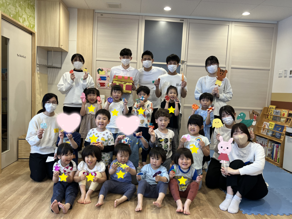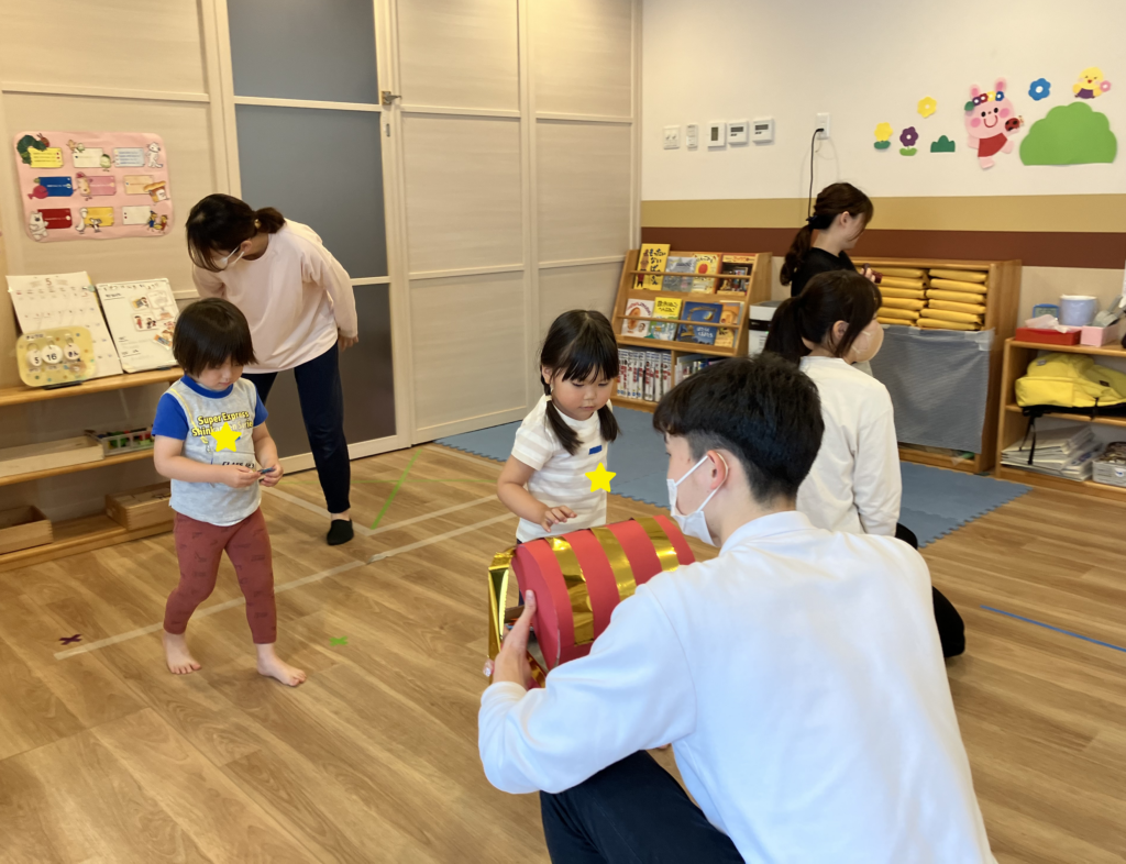子どもたちがペープサートを見ている間に、後ろでは学生さんがこっそり宝物を隠していきます…🤭