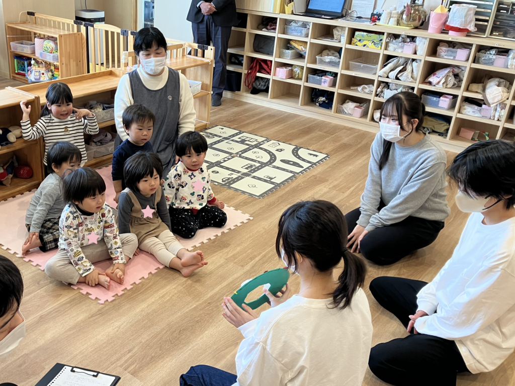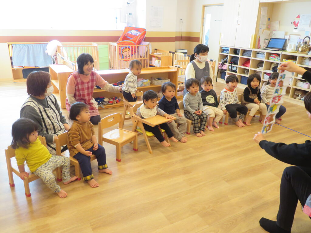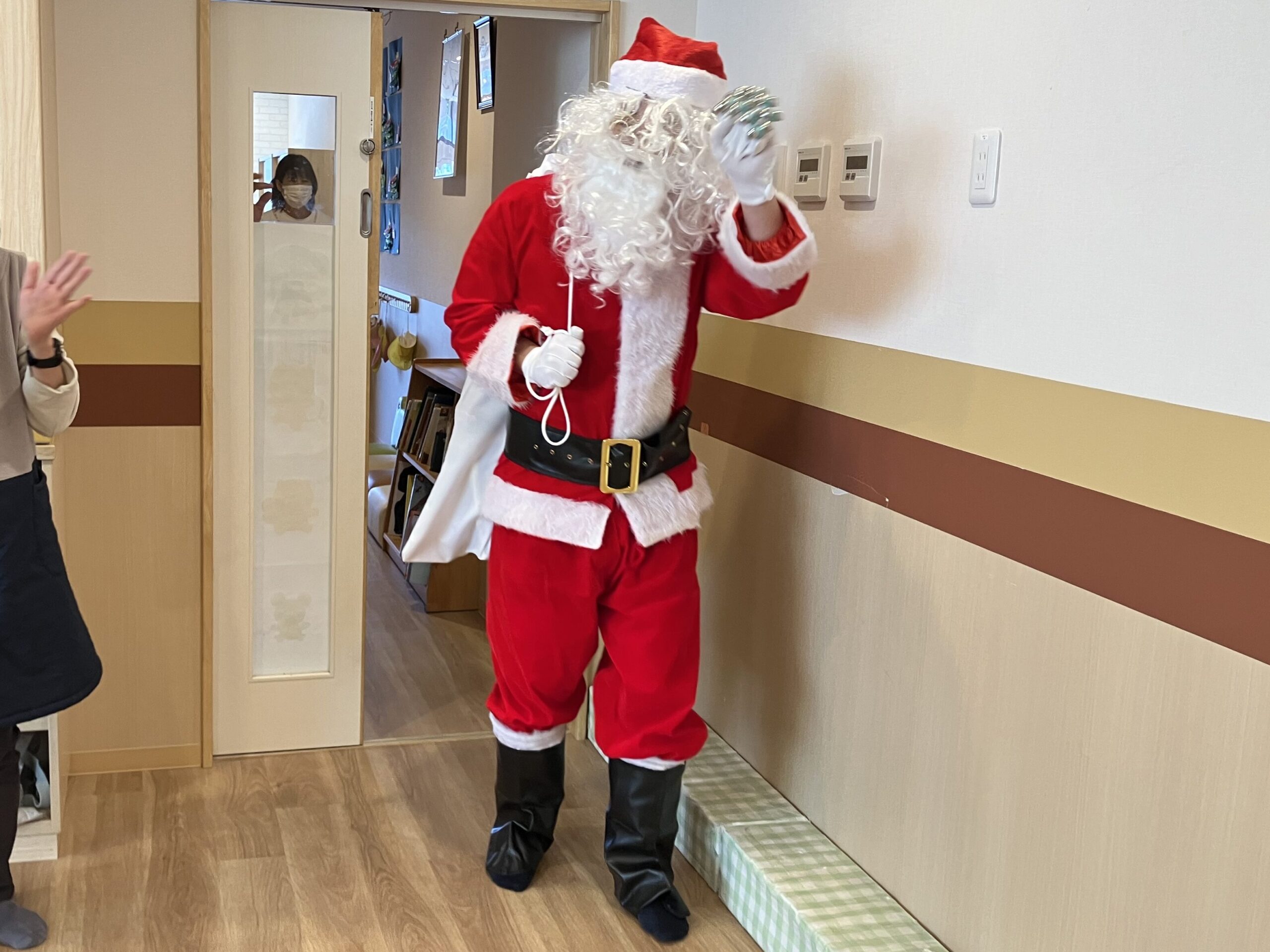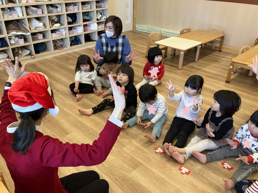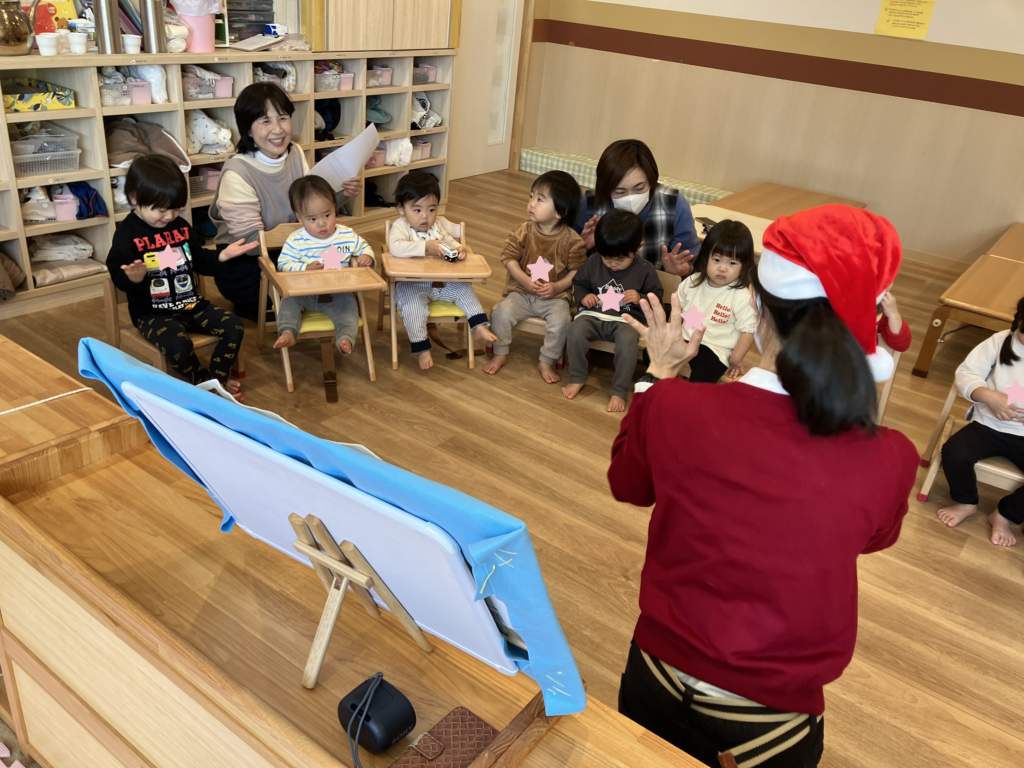 絵本を読み、エッグシェイカーを使って『あわてんぼうのサンタクロース』を歌い終わると、遠くからリンリンリン~♪と鈴の音が😲🔔