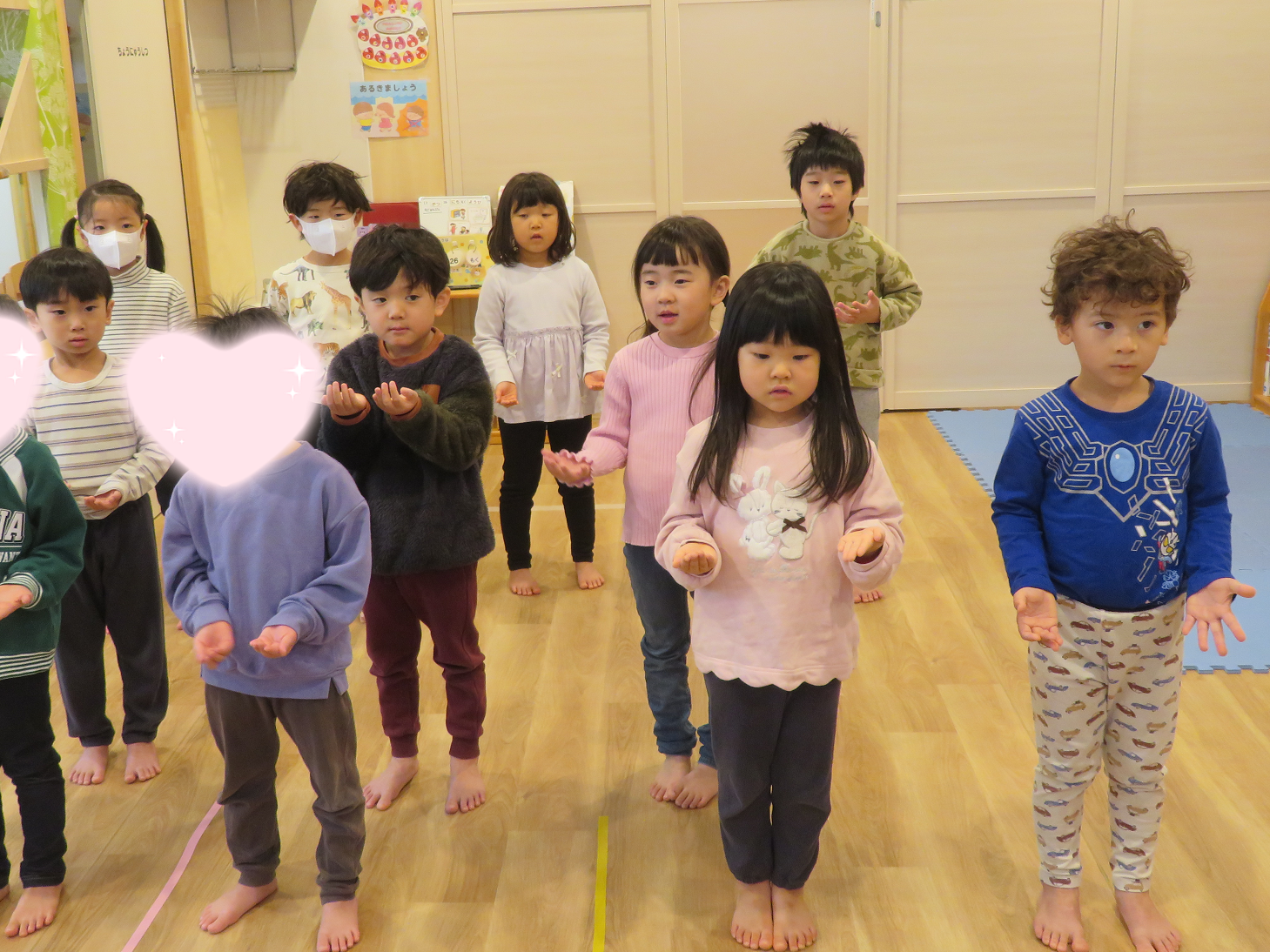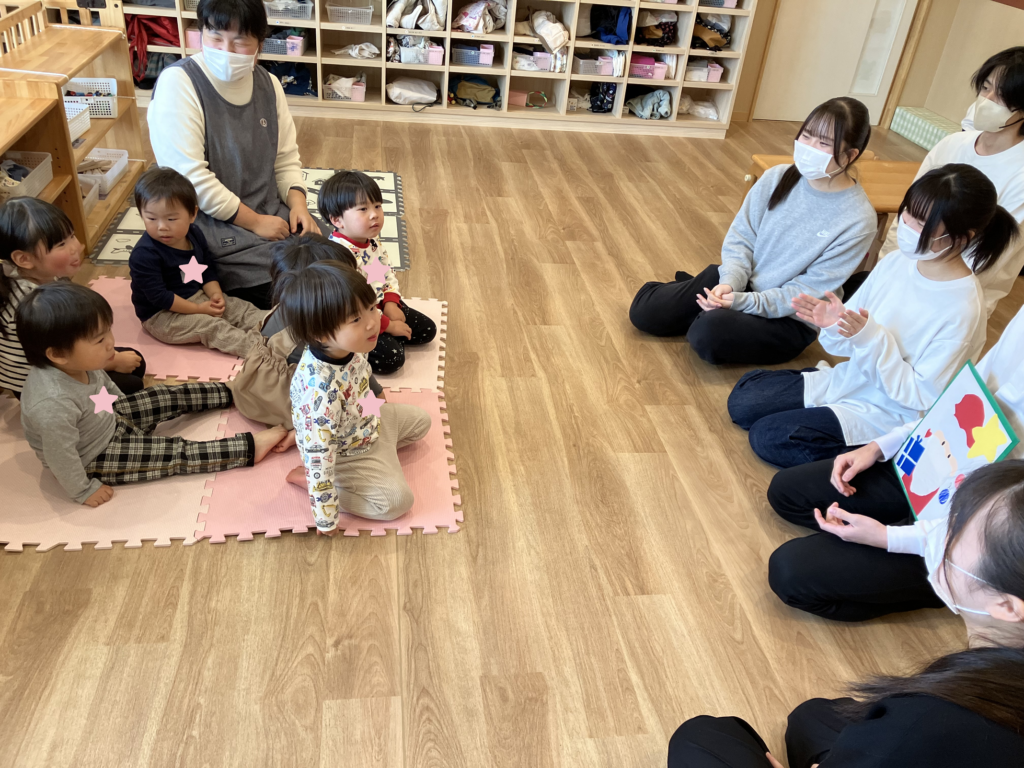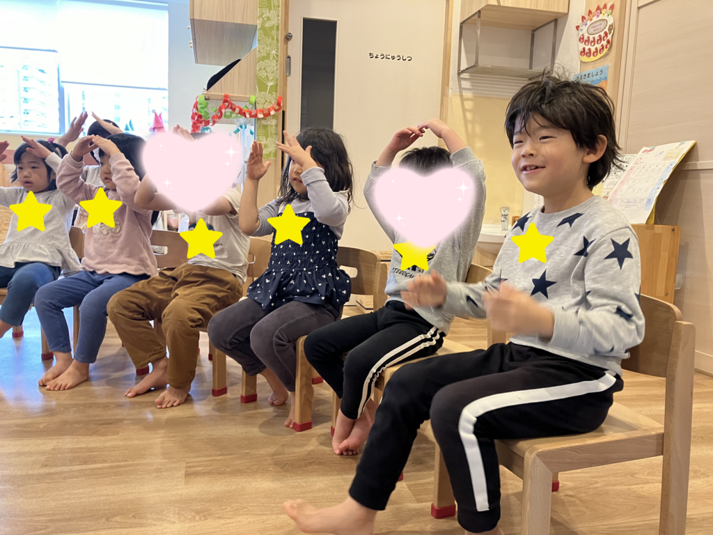 26日(木)のリトミックでは、『サンタッタ』の歌を歌いながら手と足を使ってリズム打ち♪