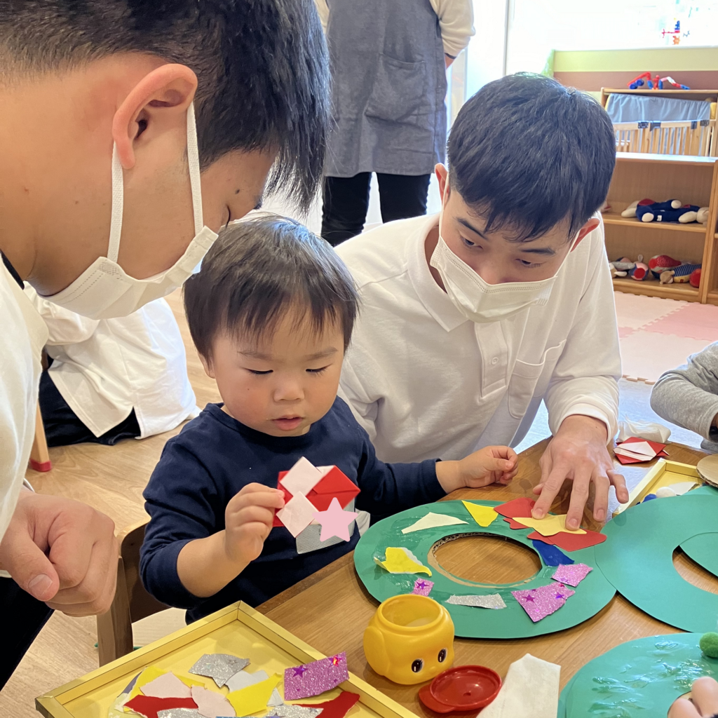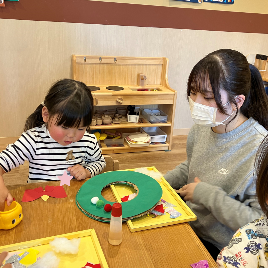 「次は何にしようかな~?」「サンタさんのお顔描く!」など、学生さんと話し合いながらオリジナルリースを作っていました!