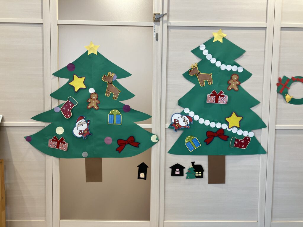 2つのチームにわかれて、先生とジャンケンをし、勝つことが出来たら自分が持っている飾りをツリーに貼り付けていきます😍