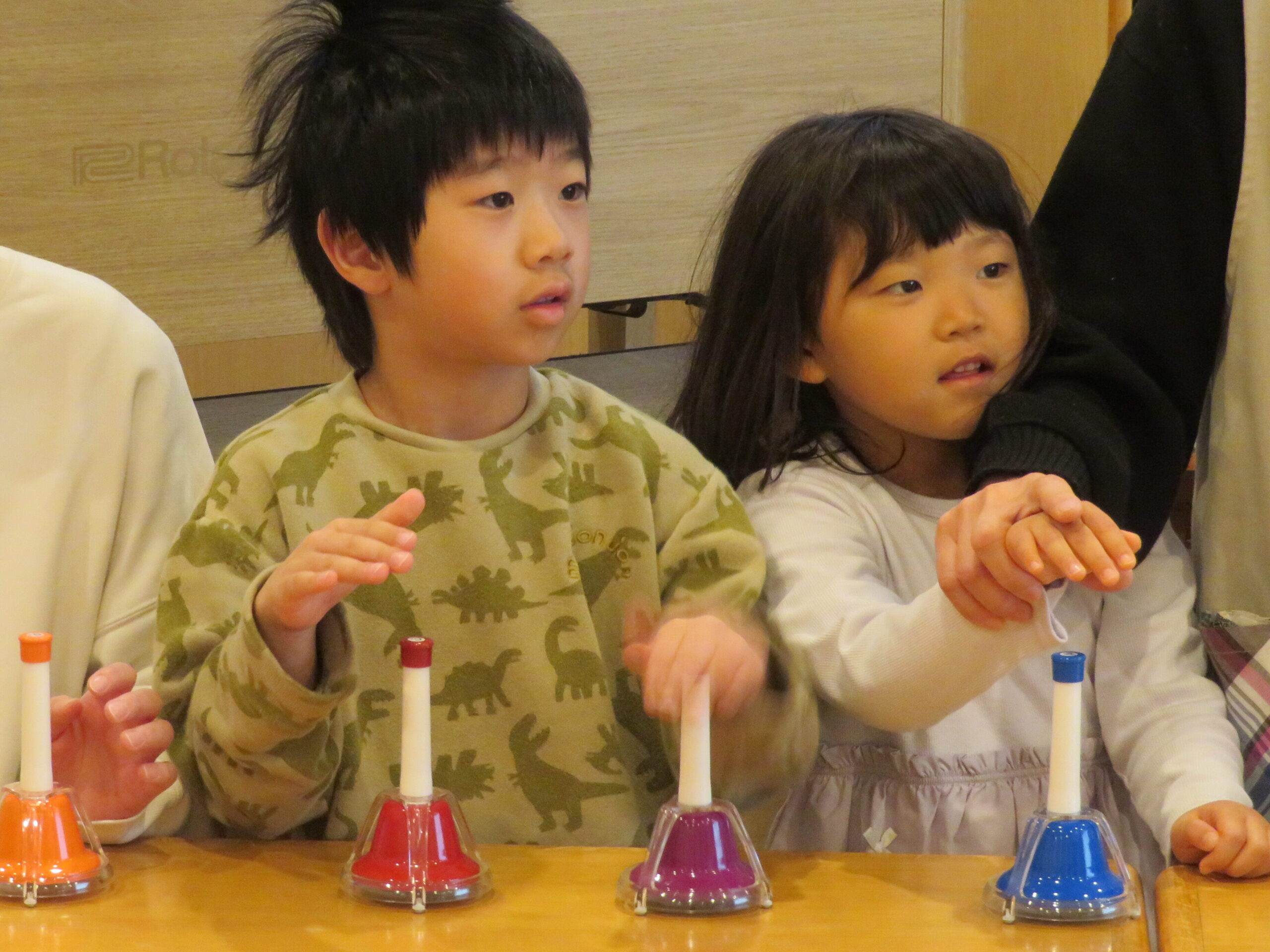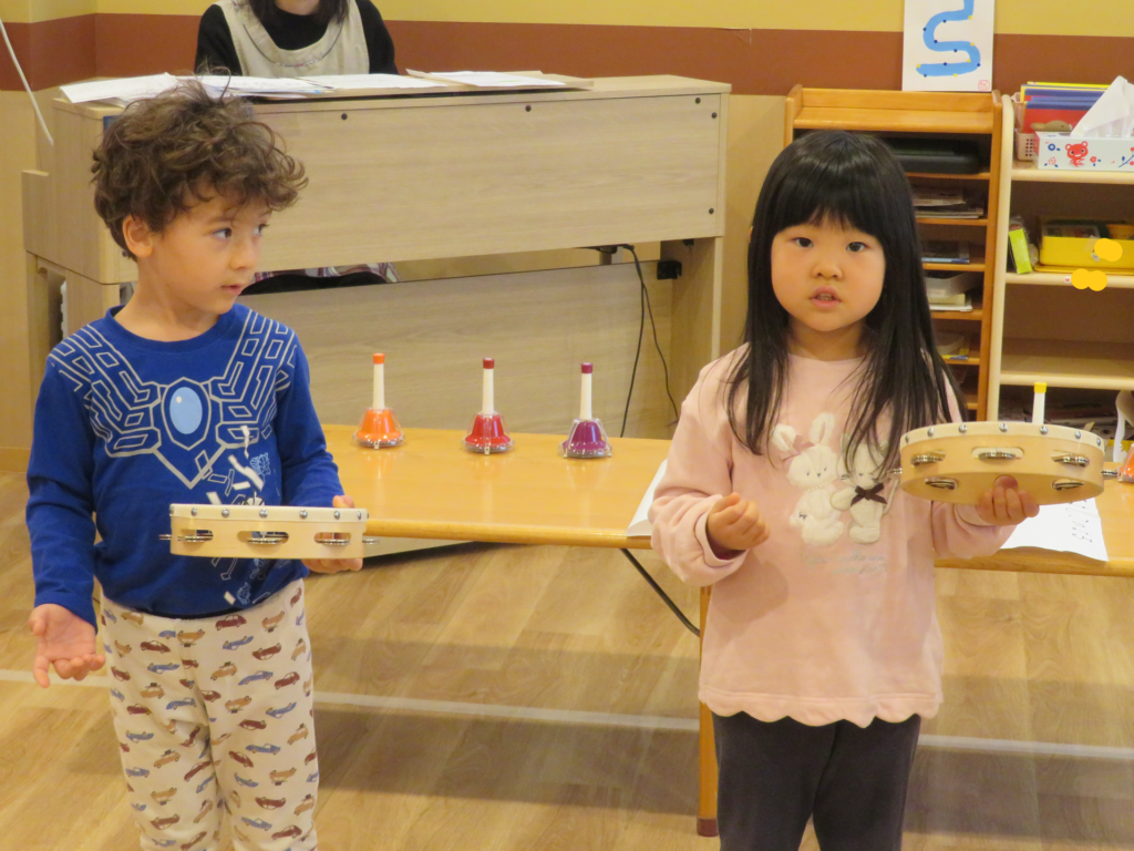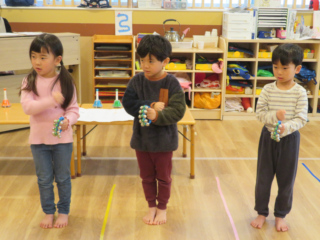 歳児ごとでは、タンバリン・鈴を使って『サンタッタ』、ミュージックベルを使って『きよしこのよる』を演奏しました♪