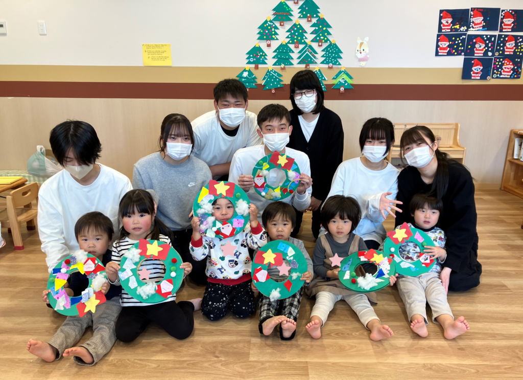 集合写真の時には、作ったリースの穴から顔をひょっこりさせる2歳児さんに「かわいい~♡」と、学生さんがメロメロでした🥰