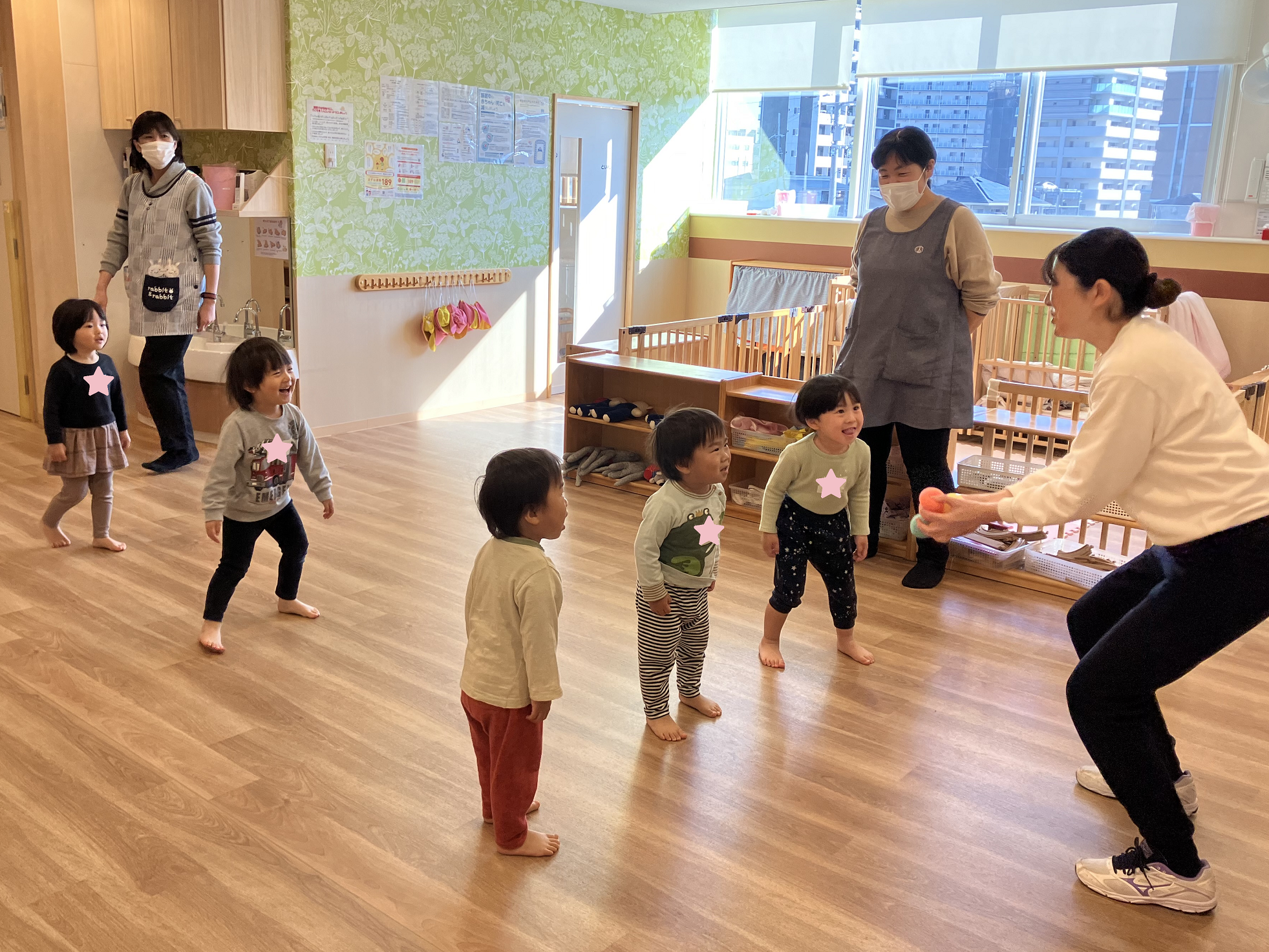 「カエル」「ちょうちょ」「うさぎ」になりきって全身運動をした後は、ボールキャッチ♪(≧ω≦。)