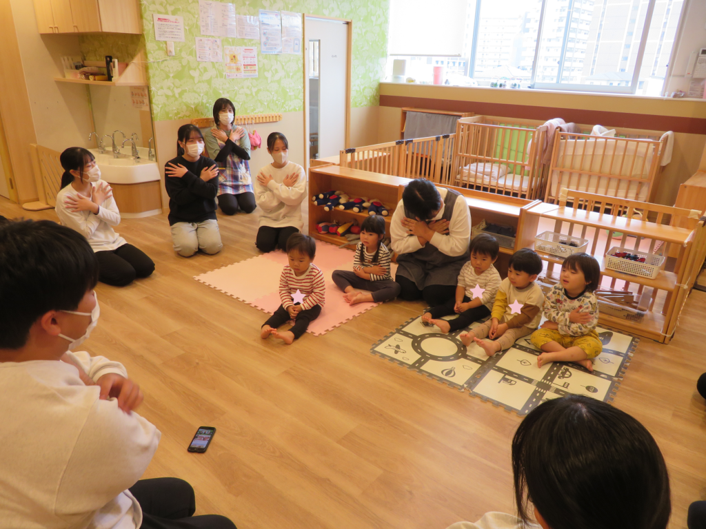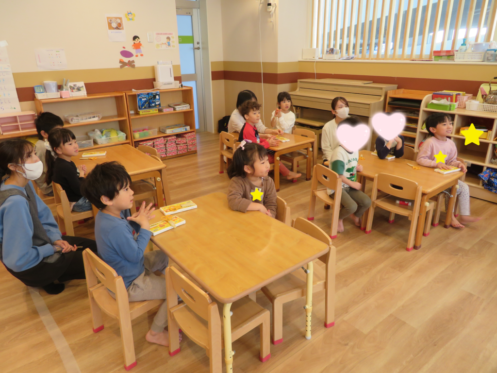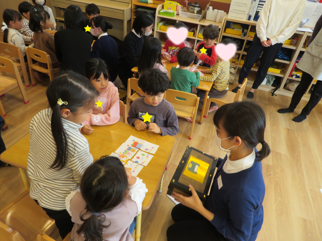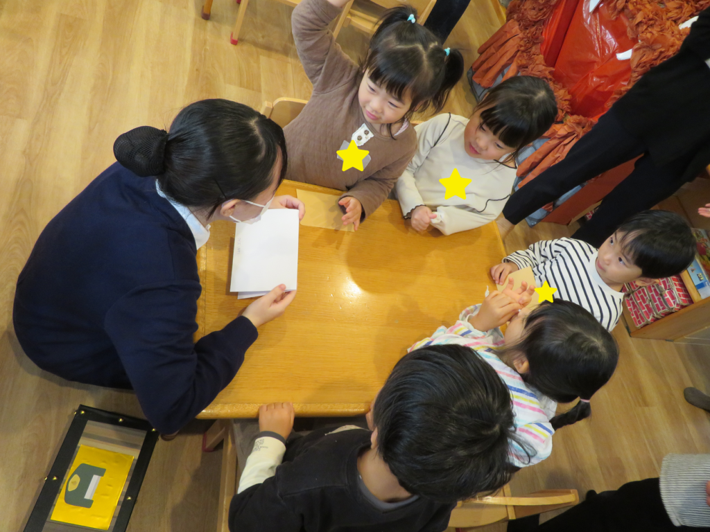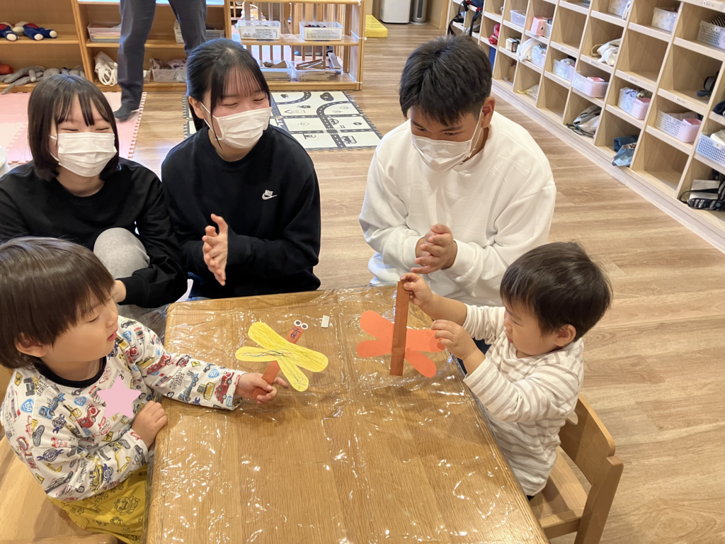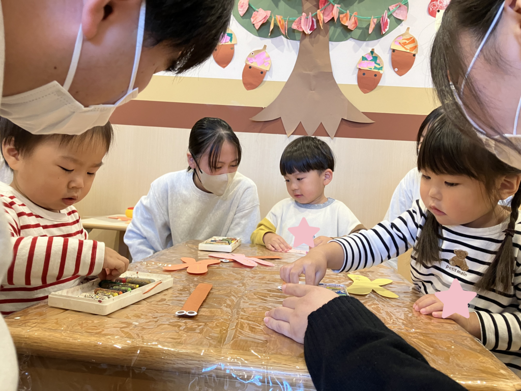 製作前の導入では、学生さん手作りの絵本📖を読んでもらい、さつまいもやどんぐりなど知っているものが出てくると「知ってる!!」「赤色の葉っぱ!!」などの会話のやりとりもしていました🥰