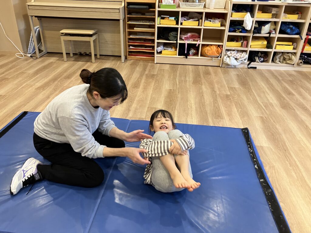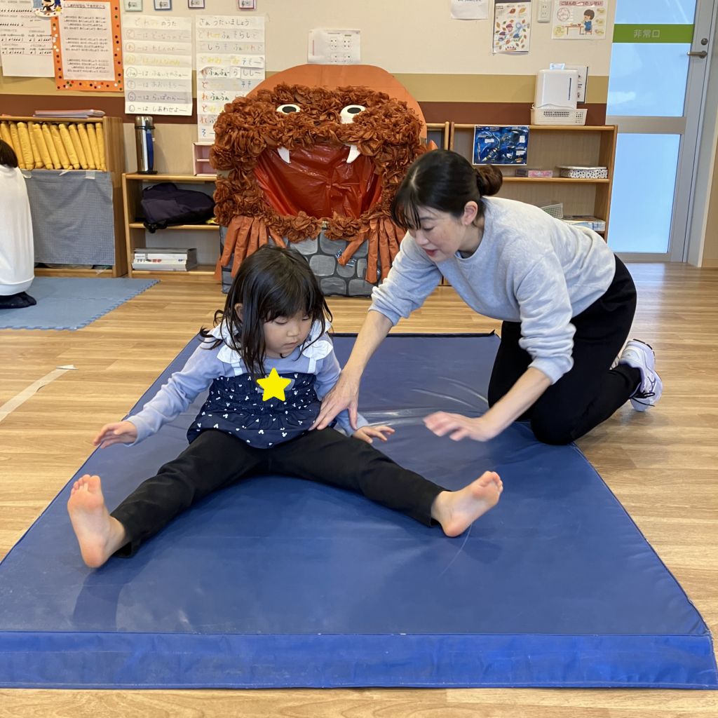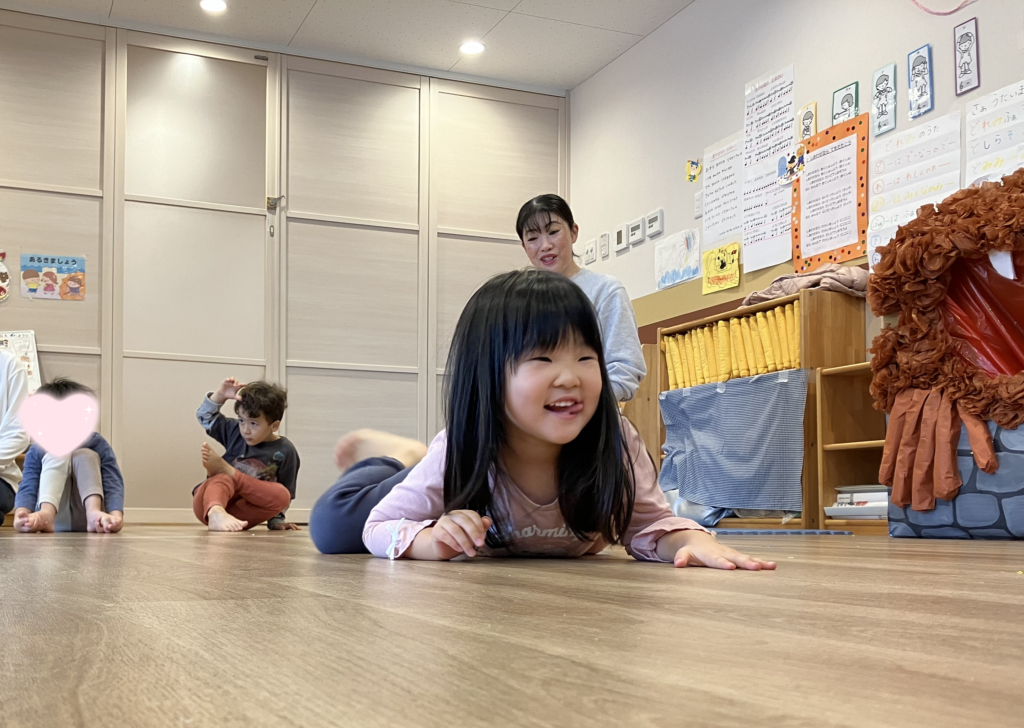 同時に手足を動かす動作と、時差をつけて手足を動かす動作に「むずかしい💦」と少し苦戦しながらも、コツを掴むと笑顔で取り組んでいました♪