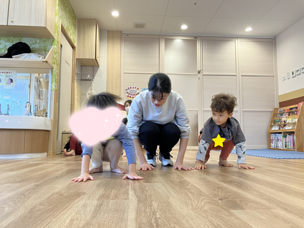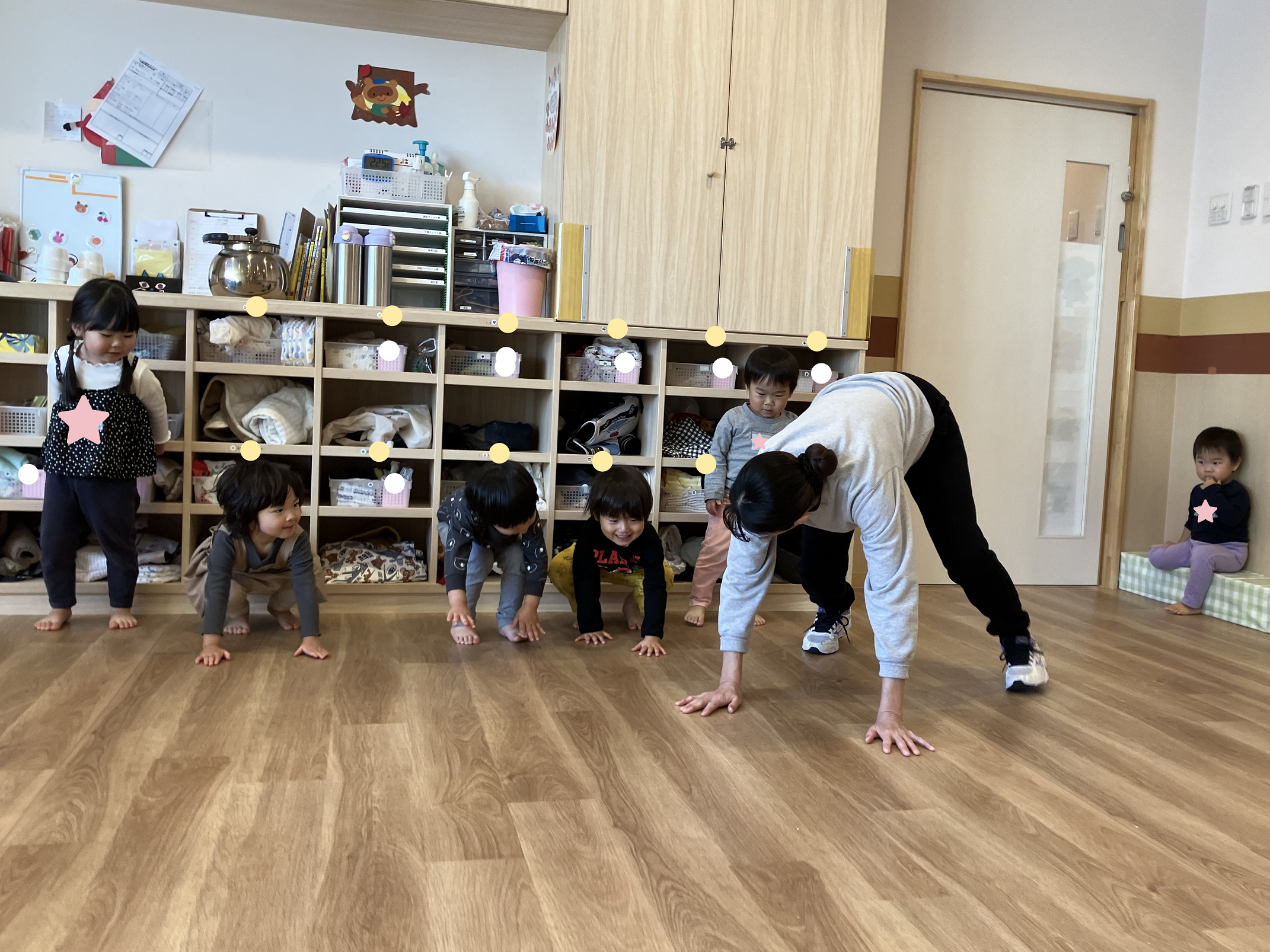 動物の動きやマット運動では、腕や足を真っすぐ伸ばすことを意識😊