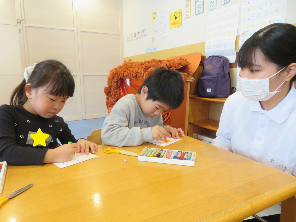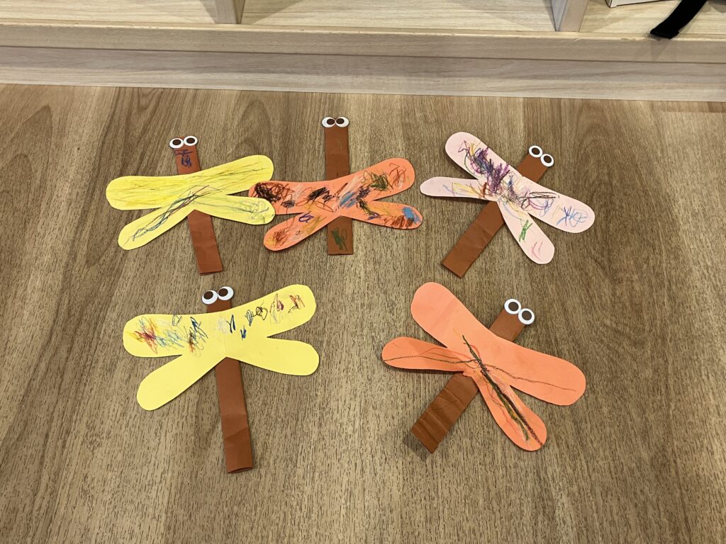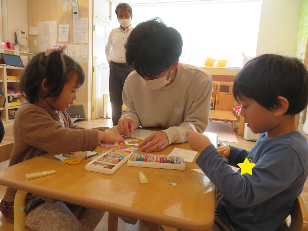 クレヨンを使って好きな色で羽を塗り、完成した物をお友だちや学生さんに発表しました👏